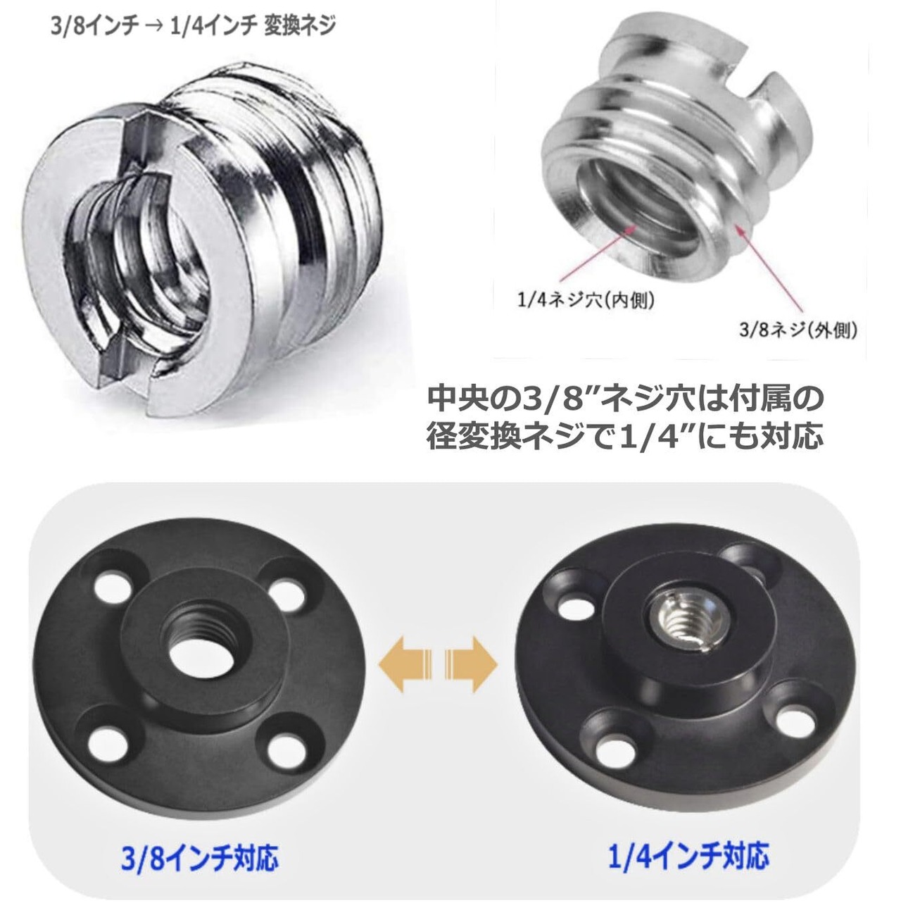【撮影デバイス固定台】3/8インチ、および1/4インチネジ穴(径変換アダプター)を備えたベースプレート カメラ三脚固定台です。付属のネジ径変換アダプターを使用することで、1/4", 3/8"仕様の幅広い撮影機材や音響機器に対応します。別売のアダプターネジ(1/4-1/4, 1/4-3/8, 3/8-3/8;オス-オス, オス-メス, etc.)を使用することで自由雲台・ボールヘッド、ティルト マジックアーム、チルト角度変更アダプターなどにも対応、室内・野外・屋外・アウトドアなどロケーションを問わず写真や動画撮影での撮影機材の組み込みやスタジオ・音響機器の使用範囲が広がります。