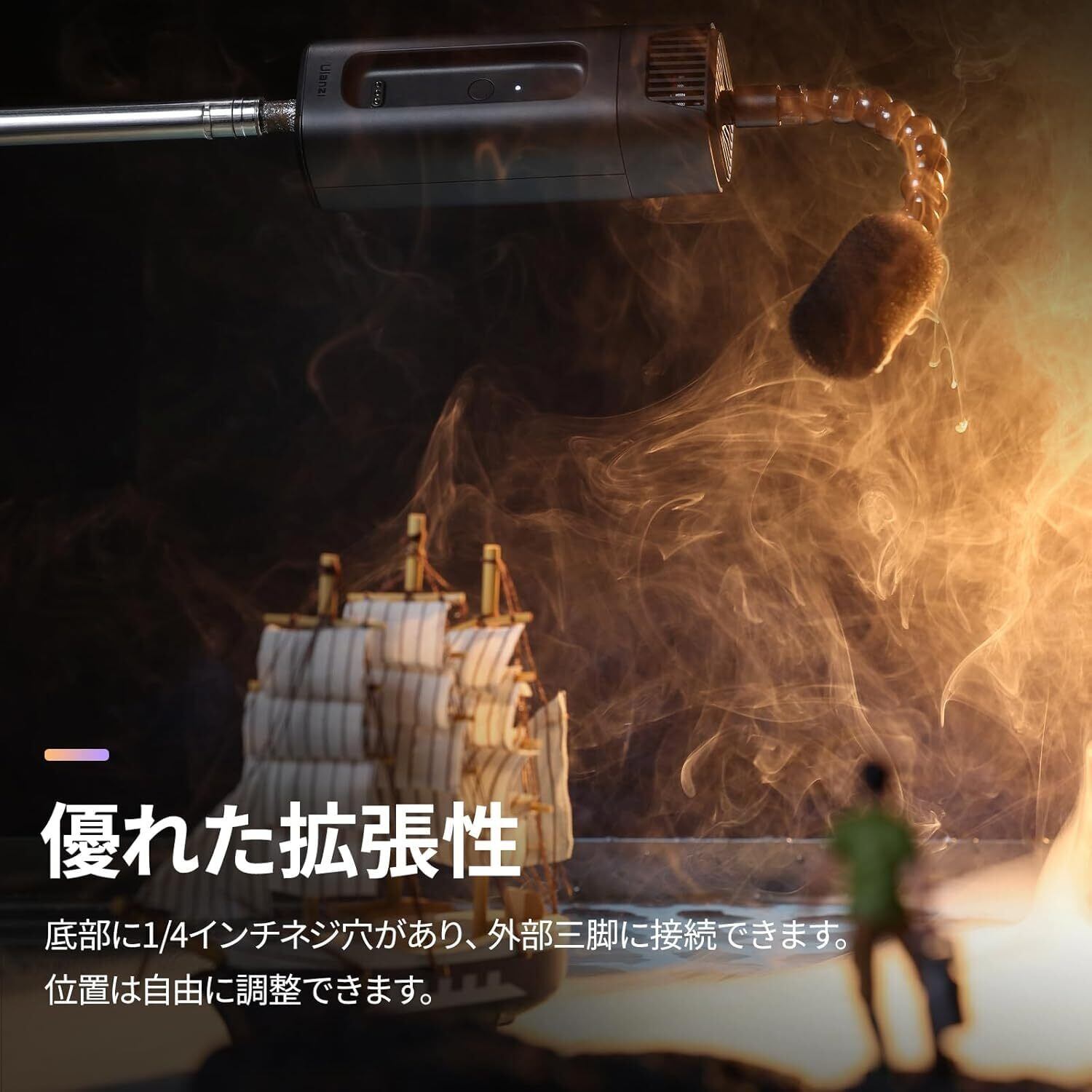 【小型でもハイパワー】全天候型で、あらゆるシーンの撮影に対応。Type-C充電ポート搭載、充電時間は約2.5時間。40Wの高出力スモークで、専用コントローラーにより噴射の強度を細かく調整可能。1/4インチネジ穴付きで、三脚やブラケットへの取り付けも自在です。