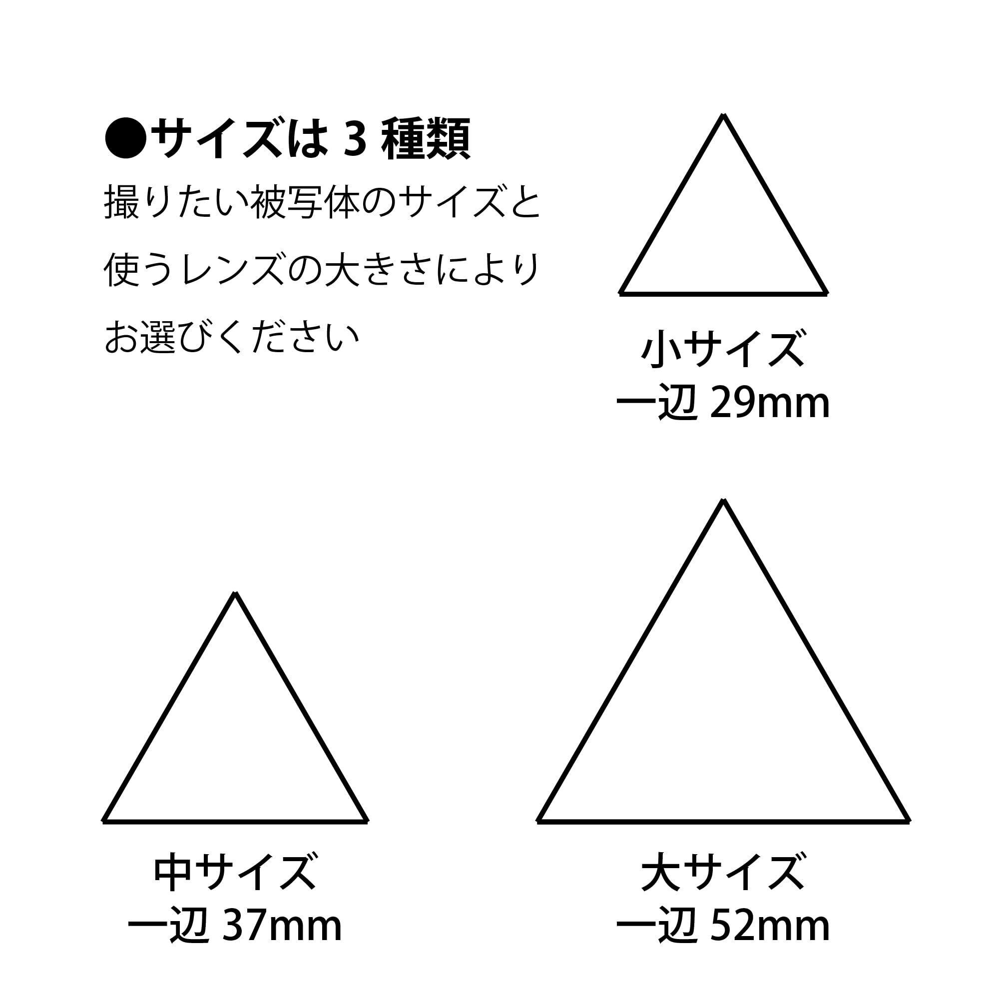 万華鏡写真を撮影するための3枚組のミラーセットです。 雑誌などに付属する安価なプラスチックミラーではなく、反射率の高いガラス製表面反射鏡を使っているためクリアな万華鏡写真を撮ることができます。 ミラーのみのセットなので、お菓子の筒などを使って工作をする必要があります。 簡単な説明書が同梱されていますが、詳しい作り方や撮影の方法は「上原ゼンジ写真実験室」の「万華鏡写真について」でご確認ください。 サイズは3種類あります。大きいサイズだと一つのパターンが大きくなり、小さいサイズだと小さくなります。スマートフォンであればどのサイズでも使用可能です。レンズが大きく万華鏡からはみ出してしまうようなものは向いていません。