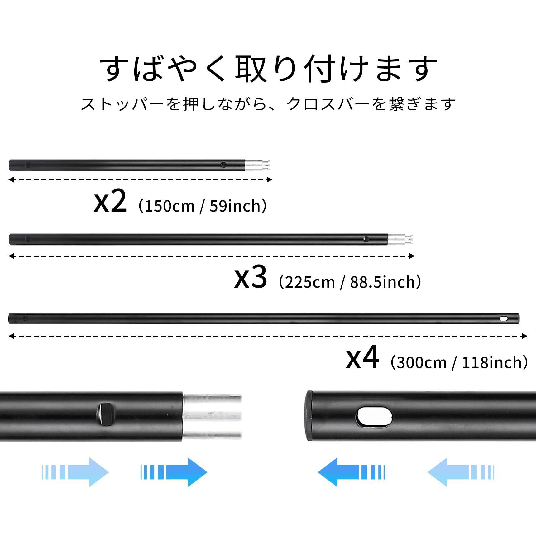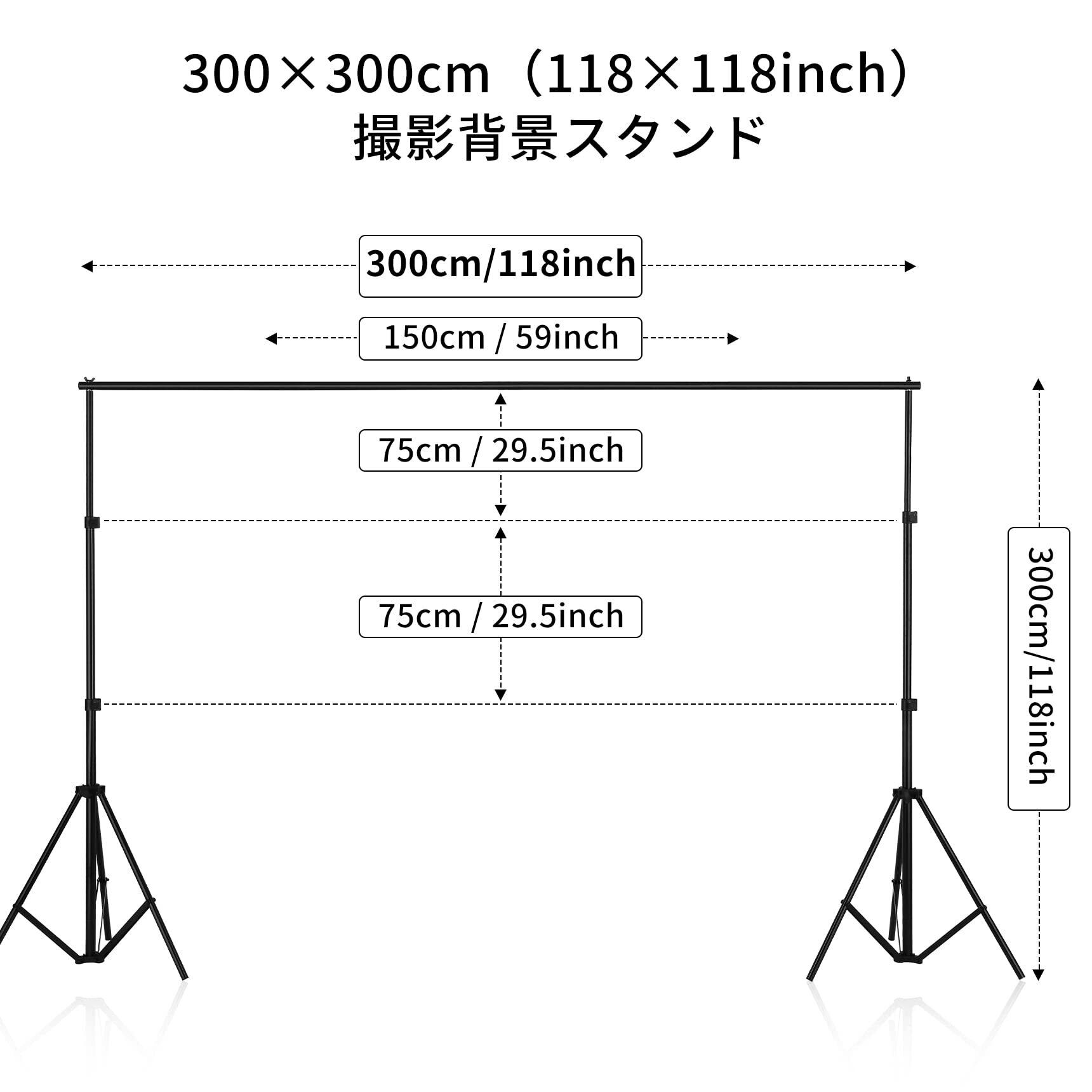【調節可能】一人でも楽に組み立てや取り外し可能の背景スタンドです。幅は150cm、225cm、300cmまで調節可能です、高さは約77cm~300cmまで調節可能です。