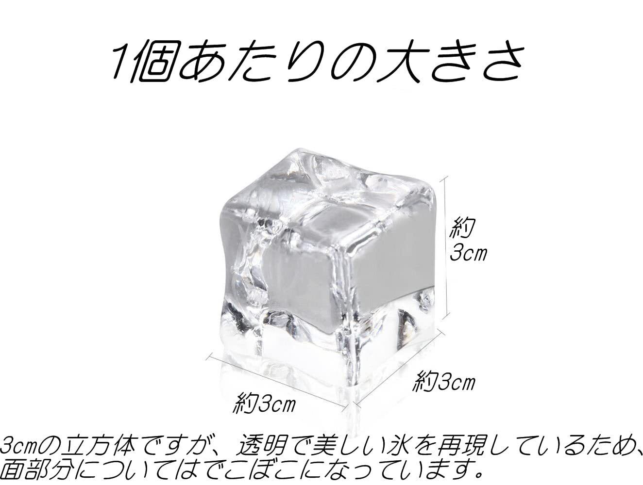 サイズ並びに形状:約3x3x3㎝の立方体 本物の氷のリアルさを追求するため、形状は不揃いな形になっています。 注意点:誤飲、誤食防止のため、保管につきましては小さいお子様の手の届かない場所にて保管してください。さらに、おもちゃとしてのご使用はお避け下さい。