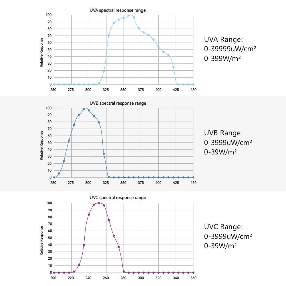 各センサーは、UVB蛍光灯、UVC水銀灯、LEDライトの下で厳密に校正されています。