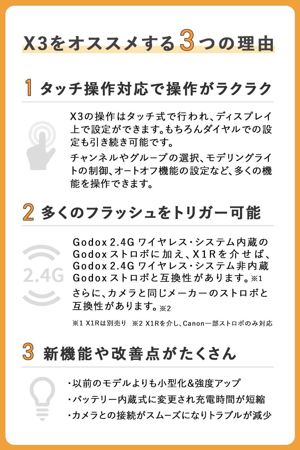 ◆【今までにないフラッシュトリガー】従来のトリガーから一線を越えた Godox X3がついに登場!革新的なデザインと操作性の向上で新たなステージに導きます。高精細OLEDタッチスクリーンを搭載し、スワイプ&タップで各種設定が可能です。スクリーンロック機能があるため、意図しない誤操作もありません。もちろんボタン操作も可能です。新たなホットシューでインストールもスムーズになります。2時間で満充電になるリチウム電池(Type-Cにて充電可)を内蔵し、電池を持ち歩く必要はございません。