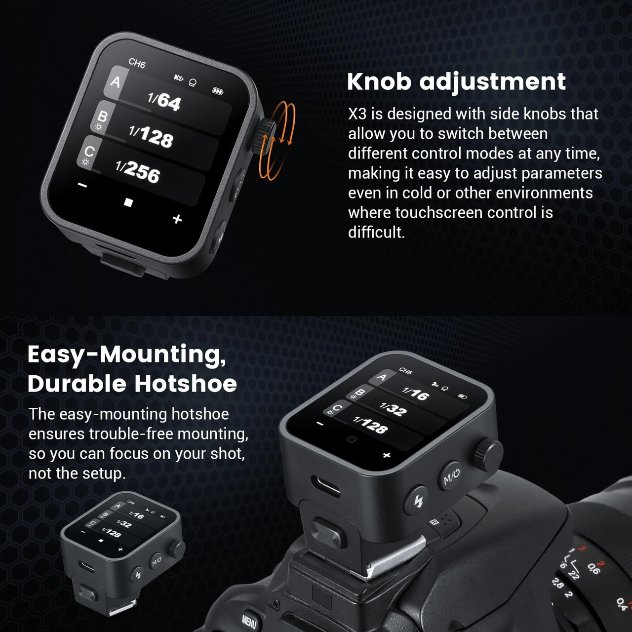 タッチスクリーンフラッシュトリガー: X3は高精細OLEDフルカラータッチスクリーンを採用し、タッチ方式ですべてのパラメータを調節することができる; X3はTCM変換機能を持ち、効率的で柔軟である