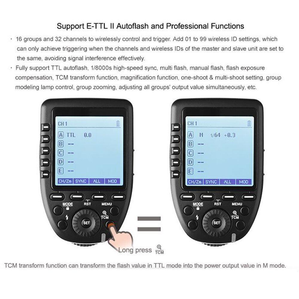 【製品パラメーター】TTLオートフラッシュ、01-99ワイヤレスID、2.4GHz、1/8000秒高速同期、マルチフラッシュ、手動フラッシュ、フラッシュ露出補正、16グループ、32チャンネルでワイヤレスコントロールとトリガー、TCM変換機能、倍率機能、ワンシュート&マルチシュート設定。 最大110ヤードの範囲グループモデリングランプコントロール、グループズーム、すべてのグループの出力値を同時に調整