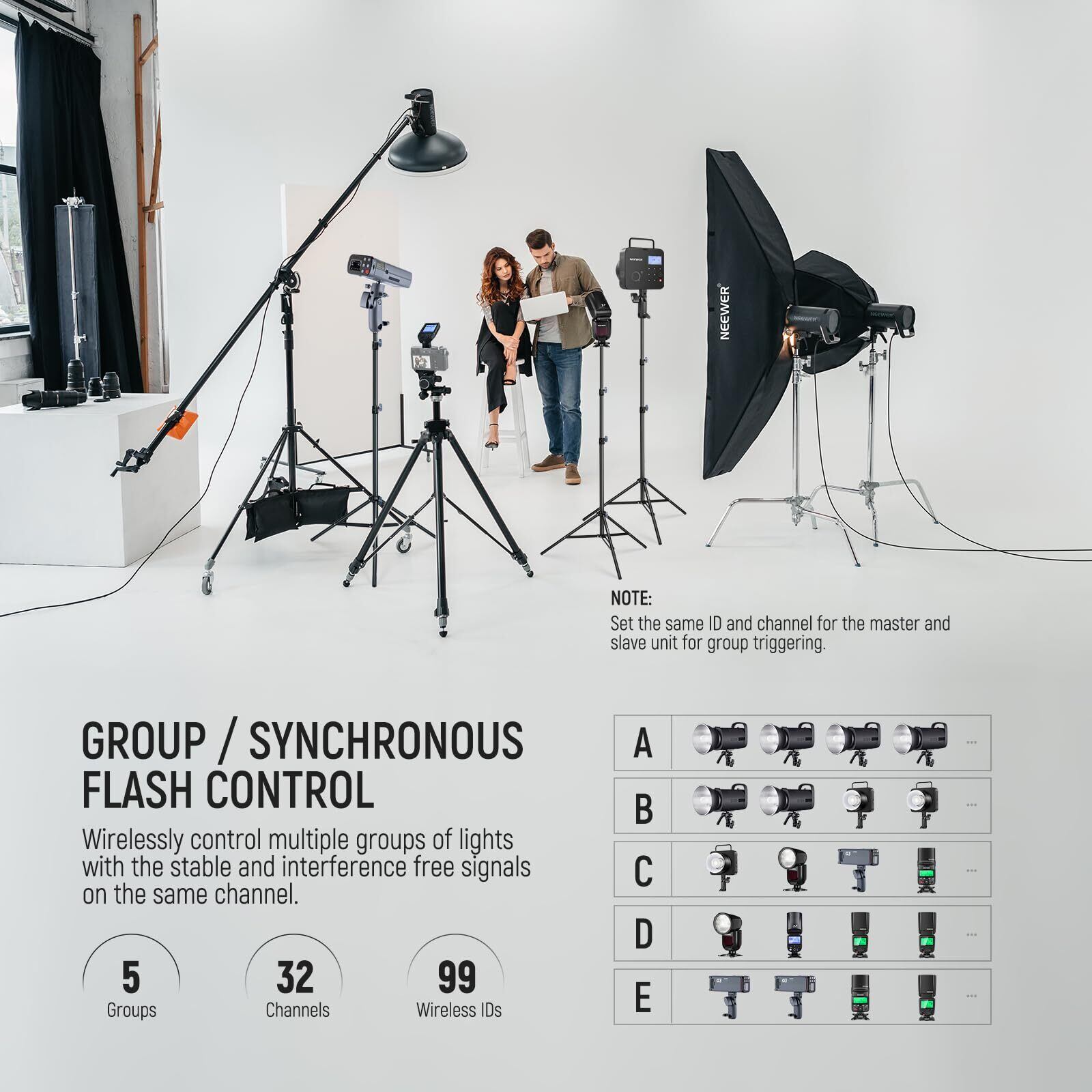【2.4G無線Qシステム内蔵】内蔵されたNEEWER無線Qシステムにより、Q4 Q3 Q300 Z2 Z1 Z760 NW760 S101-300W PRO/400W PROを無線でトリガー、NEEWER QRレシーバーと2.5mm同期コード(すべて別売)を使用して、Qシステムを使用せずに他のフラッシュを制御することもできます。また、2.4GHzの安定した接続を介して、最大5グループ、32チャンネル、01-99 ID設定のフラッシュをリモートコントロールし、すべてを同じチャンネルとID設定に設定して、信号の妨害なしにトリガーできます。