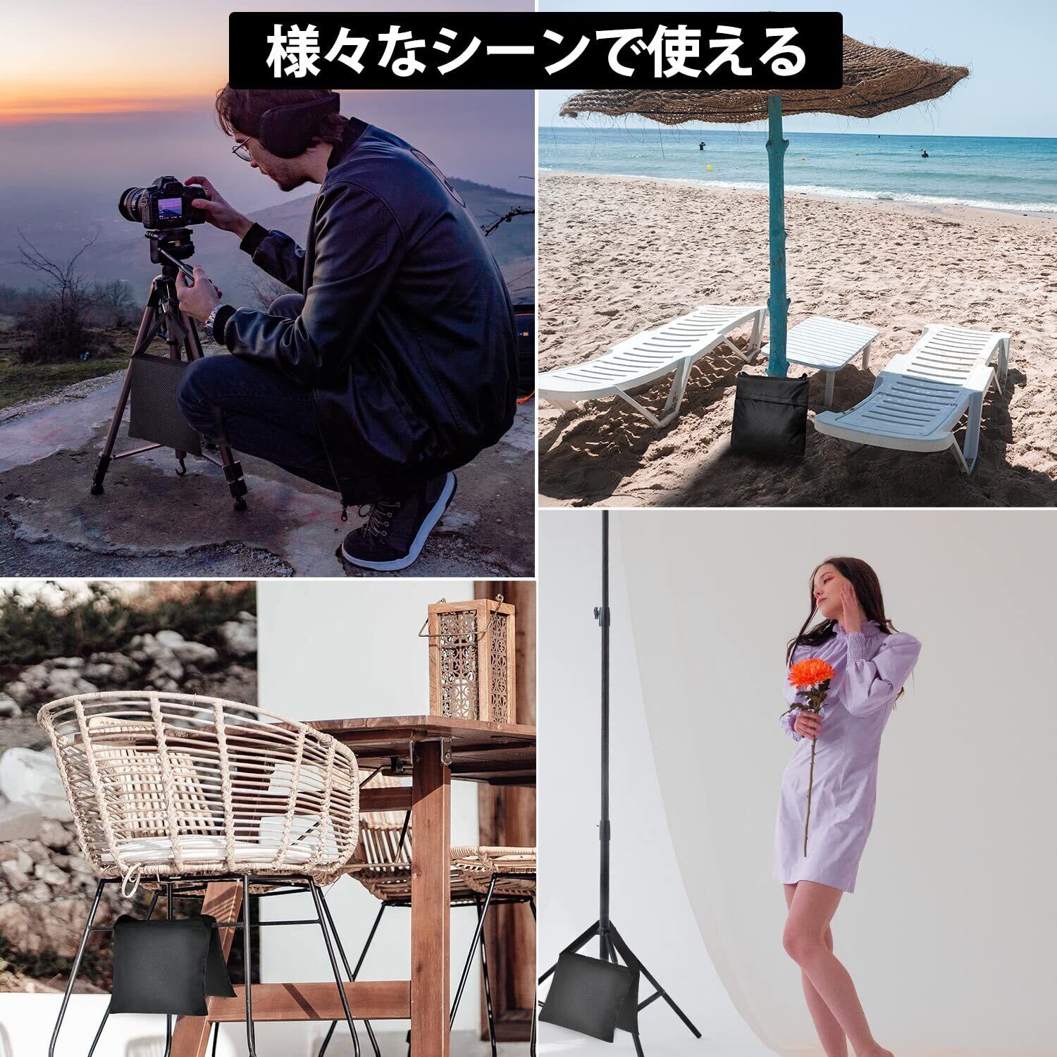 ■【広がる用途と携帯性!】EMARTサンドバッグは、フォトビデオスタジオだけでなく、アウトドアでのタープやパラソルの固定、様々なスタンドにも適用可能。軽量で持ち運びやすく、どんなシーンでも活躍します。