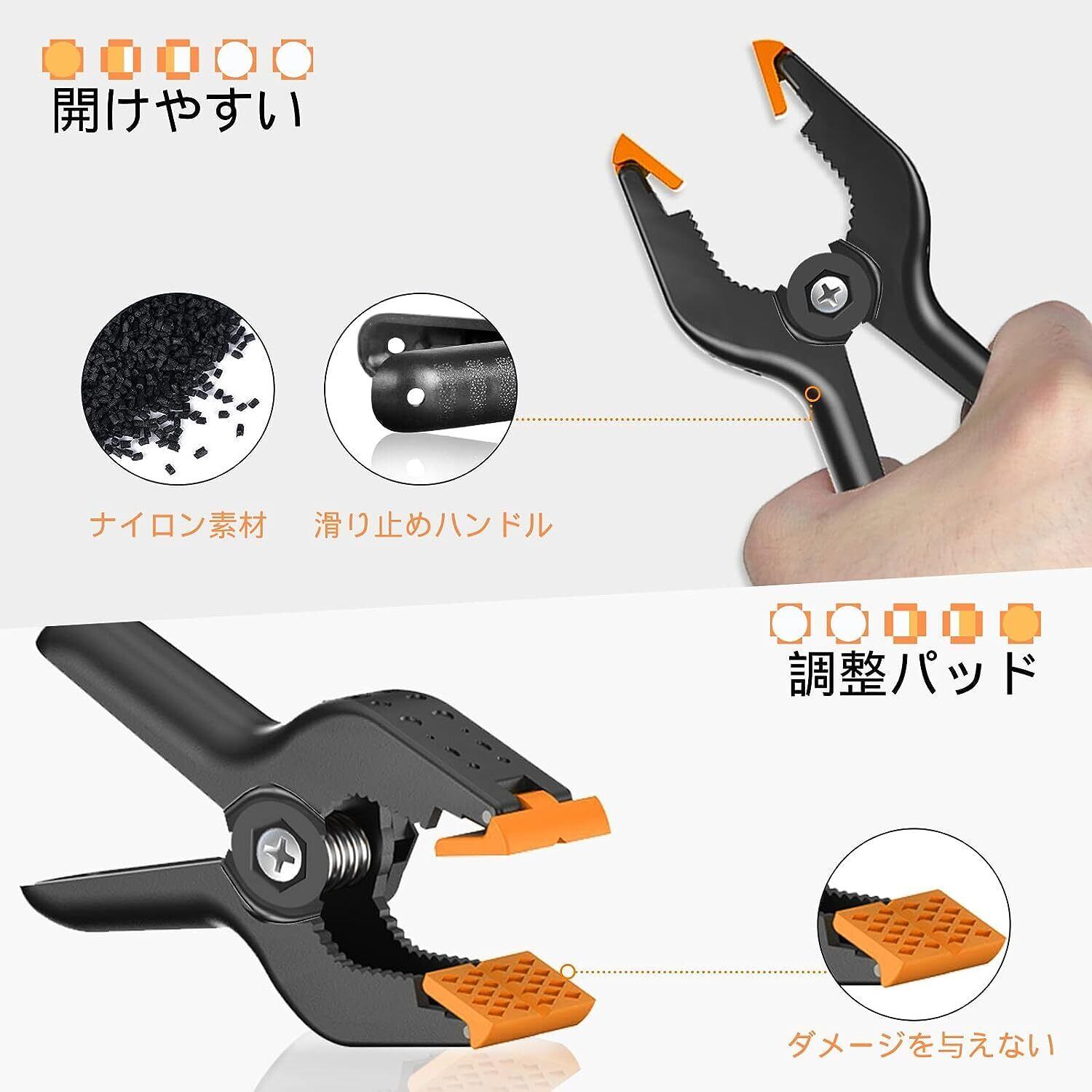 【頑丈なスプリングクランプ】高品質なナイロンと金属素材が採用されて、粒子状の柄は摩擦力が大きくなり、人間工学に基づき、手にギュッと密着力を入りやすくなります。バータースチールコイルばねは一貫したクランプ圧力を発生させ、ネジで固定することで強度と耐久性を高めます。規則や不規則なものを保持することができます。ワイドな可動式パッドが凹凸に合わせて自動調整し、挟まれる物の表面を保護できます。(ご注意:オレンジ色の部分を外側に向けないでください)