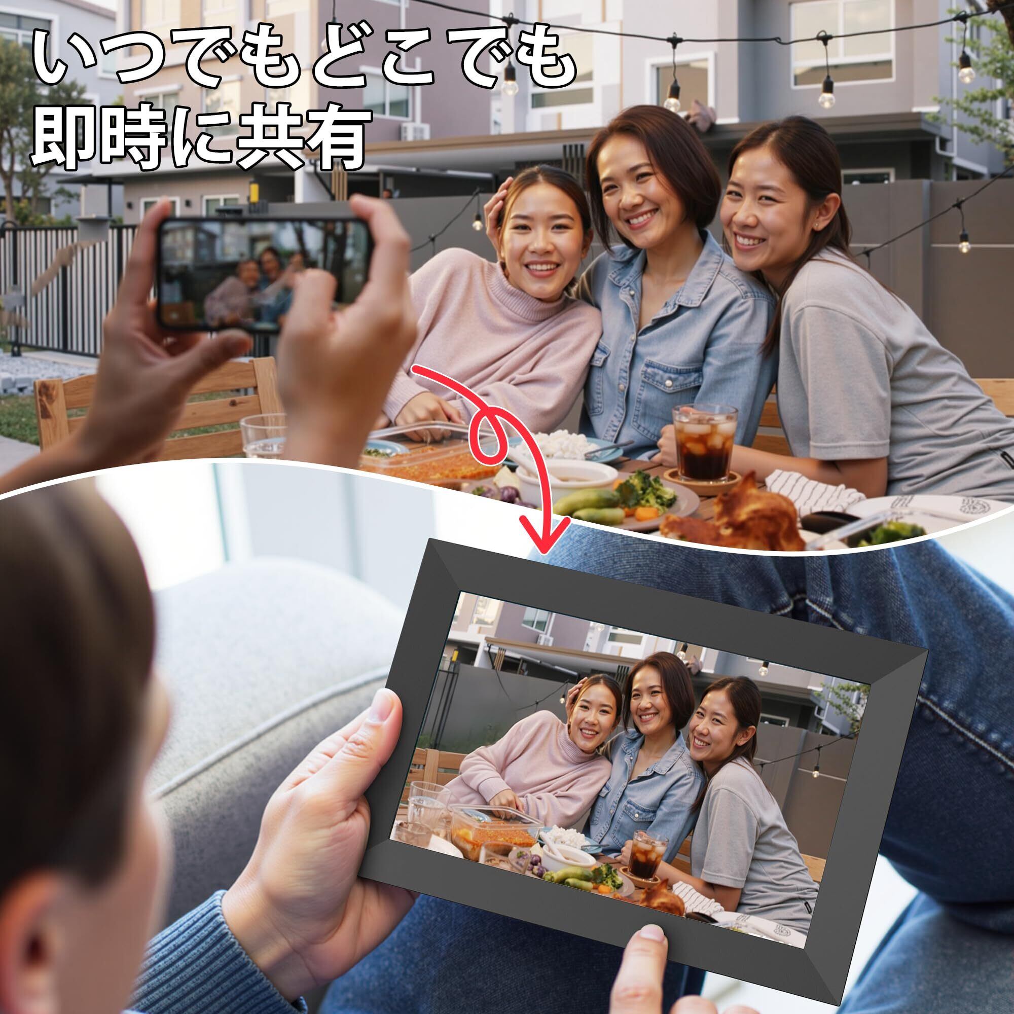 【Wi-Fiで大切な瞬間をすぐに共有】大切な写真やビデオを、Wi-Fiを通じて世界中の家族や友人と簡単にリアルタイムで共有できます。専用のFrameoアプリを使えば、2.4GHz Wi-Fiに接続されたデジタルフォトフレームに、スマートフォンから直接、写真や最大15秒のビデオを送信可能。プライバシーにも配慮されているため、安心して思い出を届けることができます。フレームに映し出されるたびに、あの幸せな瞬間が蘇り、心が温かくなるひとときをお楽しみいただけます。