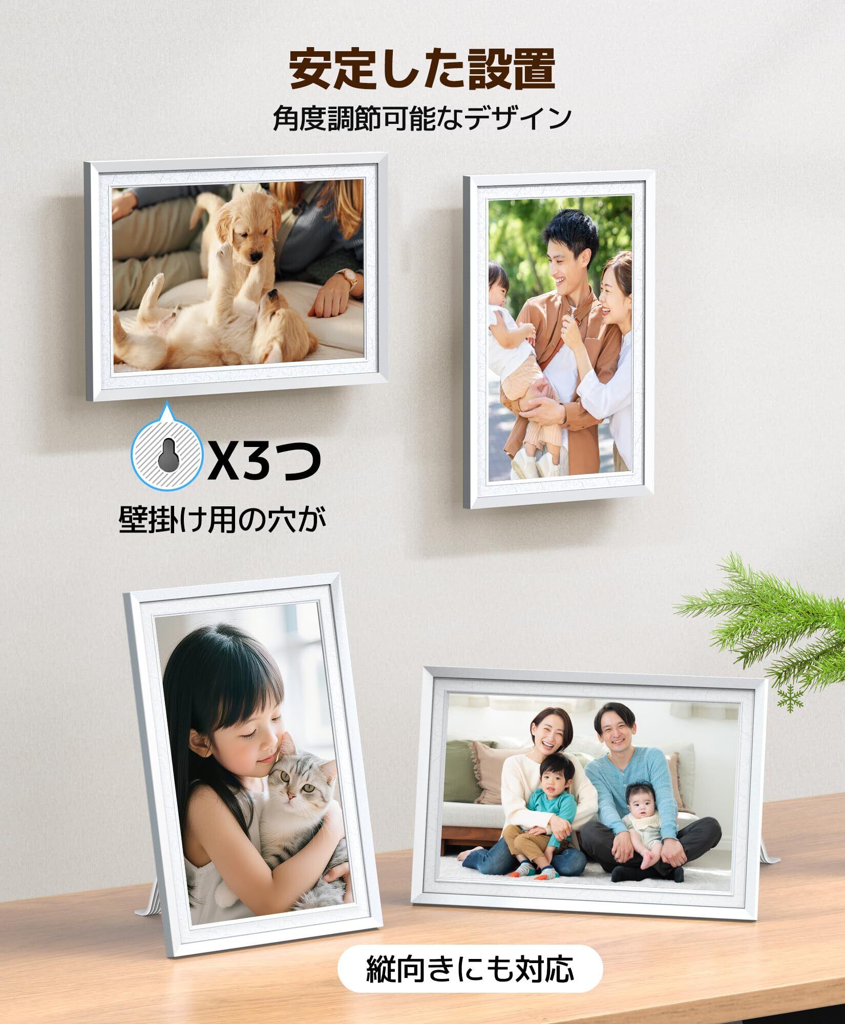 10.1インチ & Wi-Fiデジタルフォトフレーム:1280×800の高解像度と16:9のワイドスクリーン比、178°の広視野角を備え、どの角度からでもくっきりとした鮮やかな写真をお楽しみいただけます。操作は簡単で、画面タッチで明るさや音量の調整が可能。お好みの視聴環境にカスタマイズできます。製品には壁掛け用のネジと壁掛け穴を備えており、壁に掛けても、デスクに置いてもよく、大切な瞬間をいつでも家族や友人とシェアできるようになります。