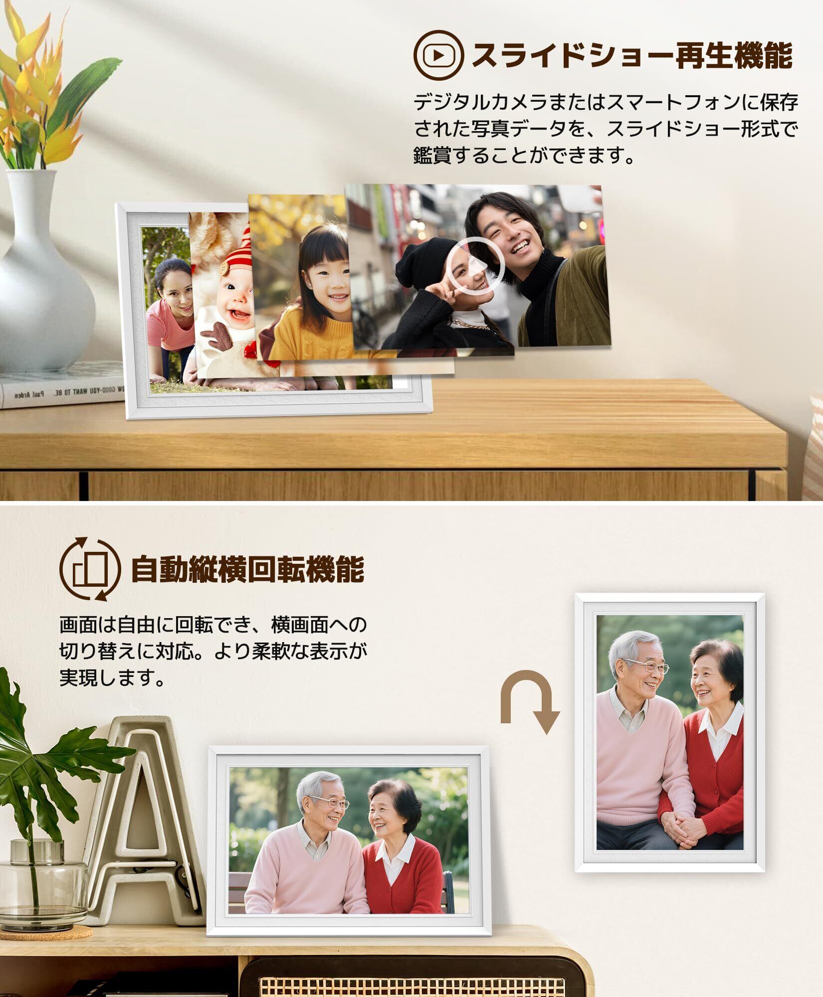 多機能 & 自動画面回転:本デジタルフォトフレームは、天気予報、時計表示、スライドショー再生、スリープモードなど、多彩な機能を備えています。画面は自動で回転するため、写真は横向きまたは縦向きに表示され、フォトフレームの向きを手動で調整する必要はありません。あらゆる方向からあなたの美しい写真を完璧に展示します。
