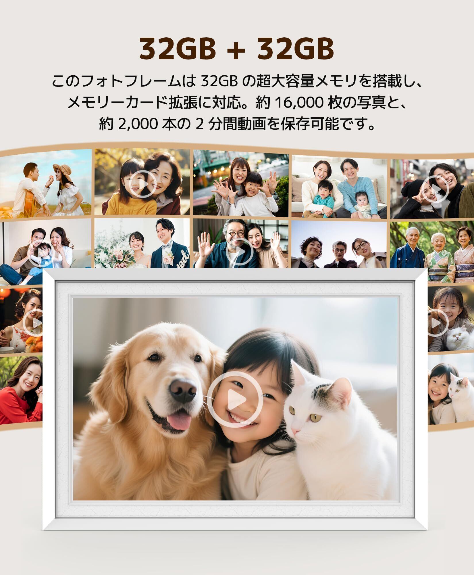 内蔵32GBメモリ & 多彩な転送方式対応:このデジタルフォトフレームは内蔵の32GB大容量メモリを搭載しており、約16,000枚の写真または2分間の動画を最大2,000本まで保存可能。日々の大切な映像を残すのに十分なスペースです。さらに最大32GBのMicroSDカード(別売)に対応し、加えてUSBメモリの直接接続、PCからの転送、ウェブサイト経由での同期など、多様な方法でコンテンツを追加や整理が簡単に行えます。ストレージ容量を心配する必要はなく、思い出のひとときを安心して保存でき、美しくクリアな写真や動画として蘇り、日常の温かい瞬間を静かに楽しむことができます。