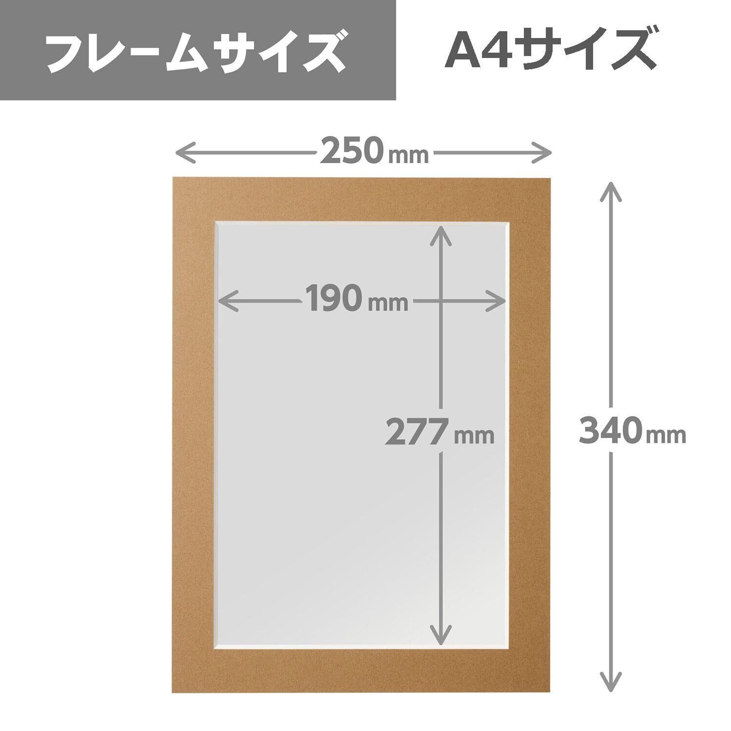 ■材質:紙、■外寸法:約W250×H340×D5.3mm、■対応写真サイズ:A4サイズ(210×297mm)、■中抜きサイズ:約W190×H277mm、■重量:約210g、■スタンド、壁掛け穴:あり、■付属品:透明PPシート