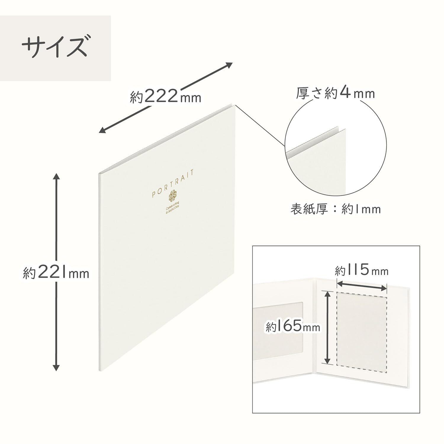 【仕様】2面 二つ折り、タテヨコ兼用、【対応写真サイズ】2Lサイズ(W127×H178mm)、【表紙厚】約1mm、【外寸法】約W222×H221×D4mm、【中額中抜き寸法】約W115×H165mm