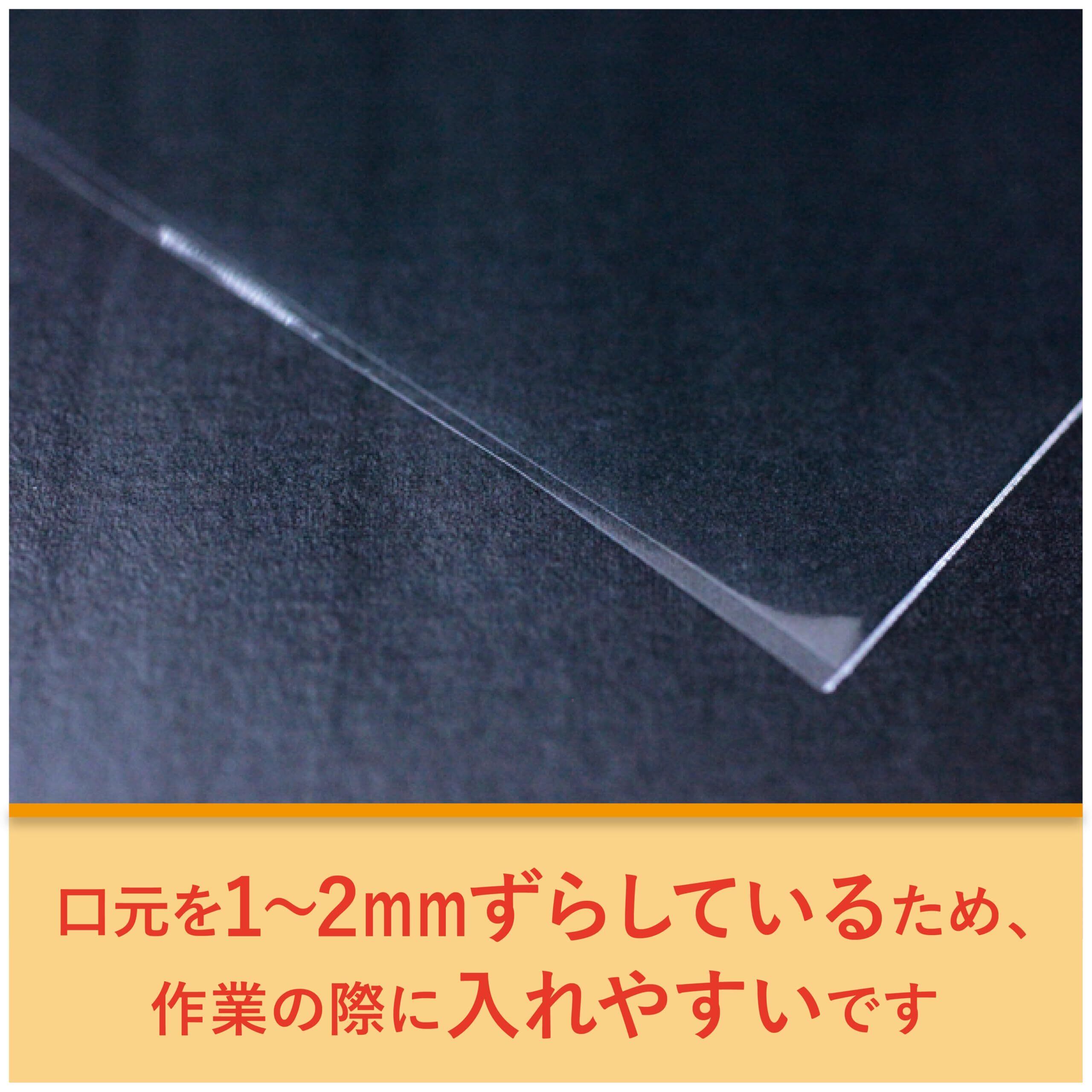 材質:OPP/厚み:30ミクロン/フタなし、テープなし。※封入がしやすいよう、封入口を少しずらしてあるタイプのスリーブです。