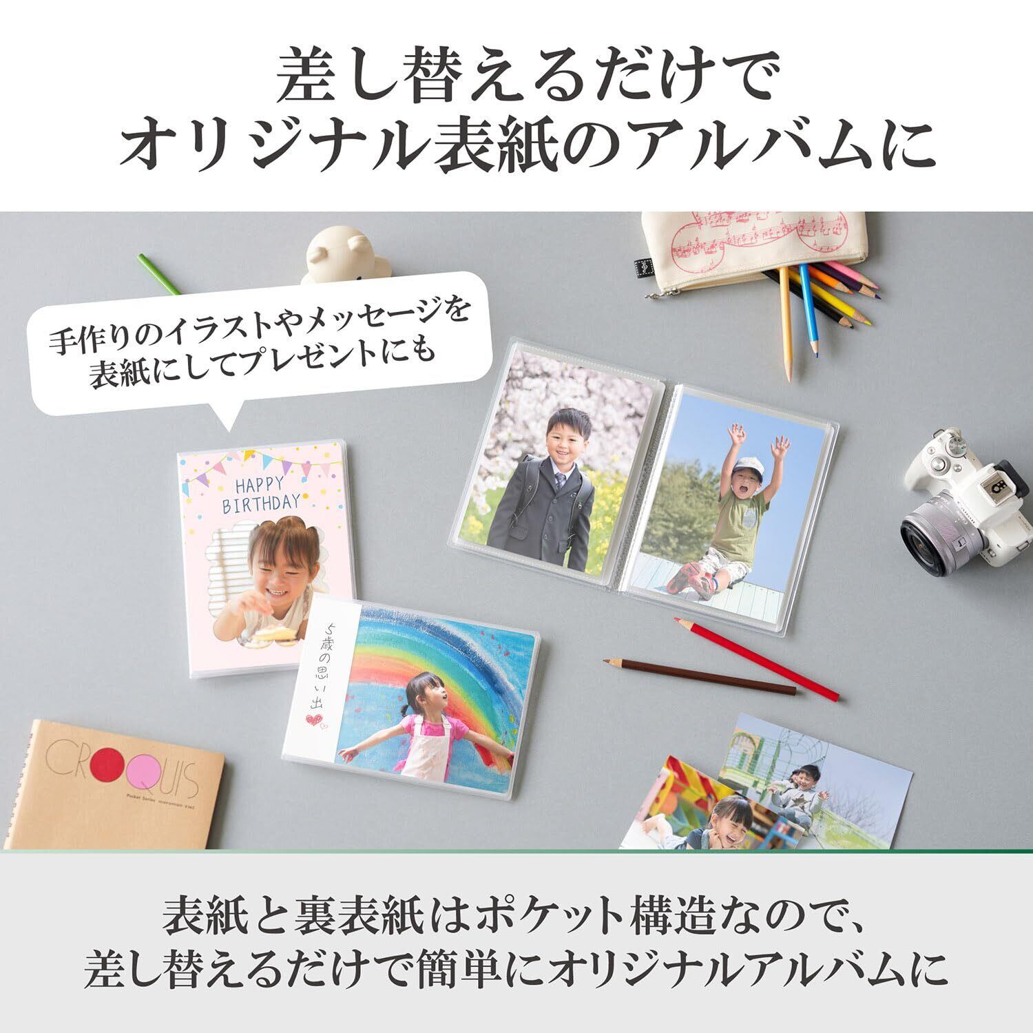 ポケット構造になっているので、表紙の写真をお気に入りの1枚に入れ替えるだけで簡単にオリジナルのアルバムがつくれます。