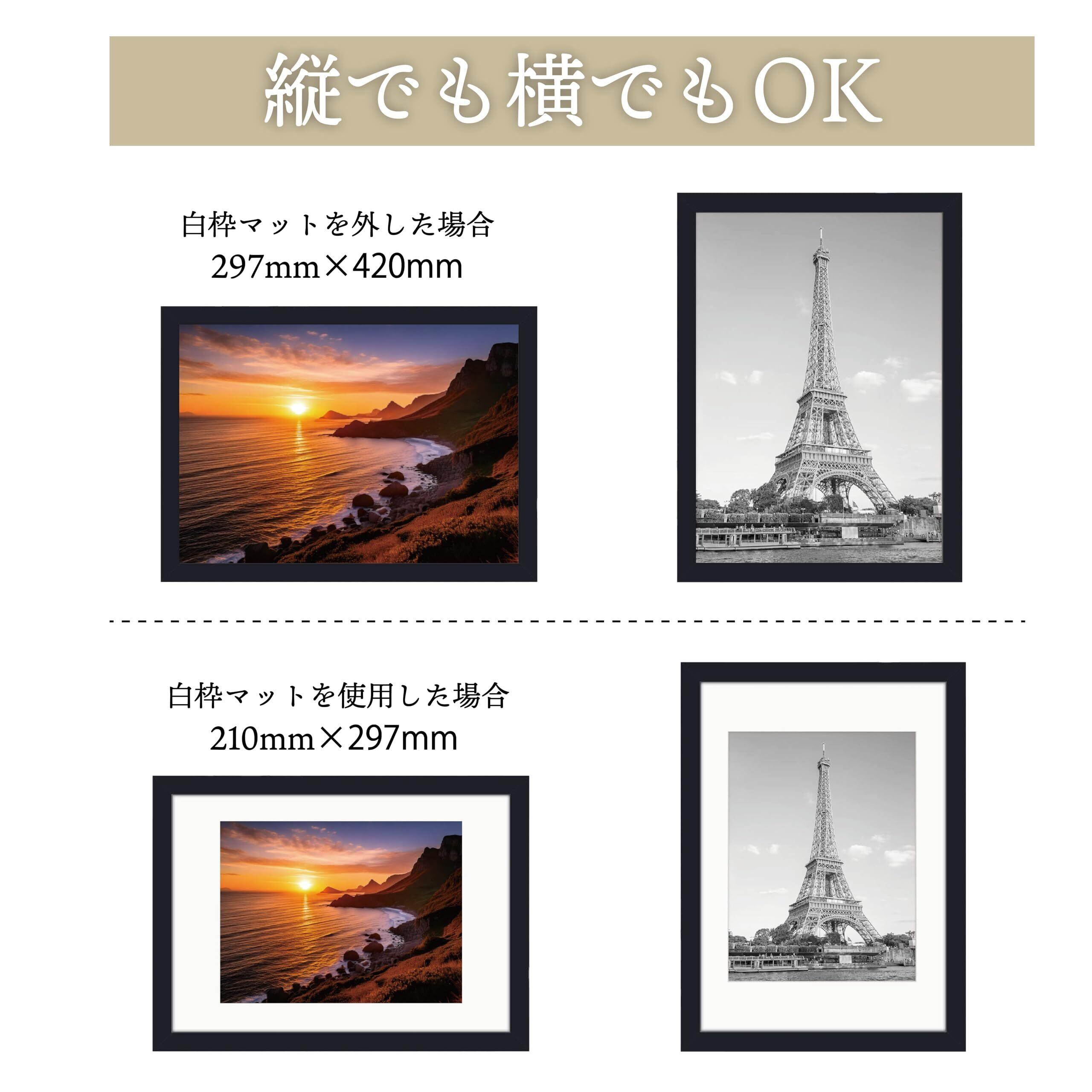 ■【A3サイズにぴったりフィット!】この額縁はA3サイズ(約297×420mm)の作品に最適で、手軽にお好きなアートや写真を飾ることができます。シンプルかつ実用的な設計で、どなたでも楽に使えます。