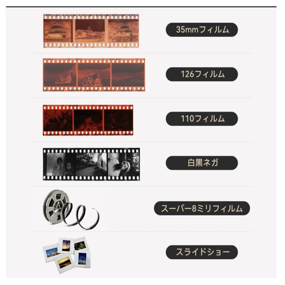 ■【多機能対応!】このフィルムスキャナーは、135フィルム、126KPK、110フィルム、スーパー8フィルム、白黒ネガ、さらにはリバーサルフィルムにも対応しており、幅広いフィルムのデジタル化が可能です。様々な思い出が詰まったフィルムを一括で保存できます!