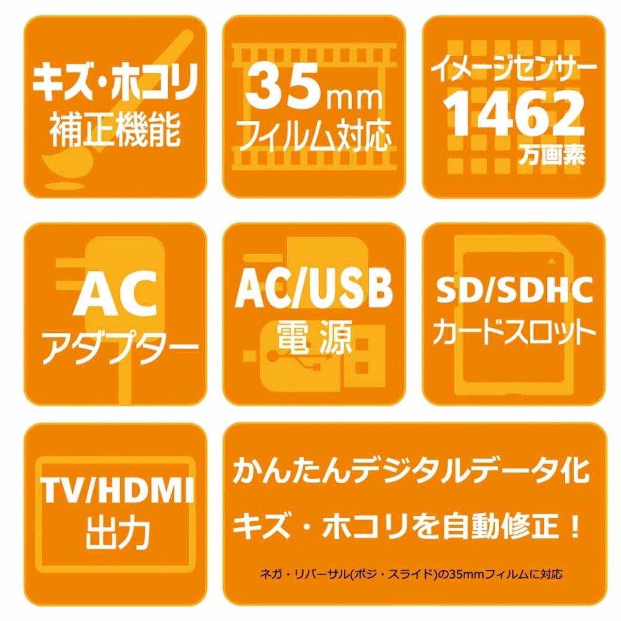 イメージセンサー : 1462万画素CMOS 焦点距離 : 固定焦点 液晶モニター : 2.4型TFT 内蔵メモリー : 約14MB SDメモリーカード : 32MB-2GB SDHCメモリーカード : 4GB-32GB 露出補正 : 6段階 色調補正 : 6段階 スキャン解像度 : 3000dpi 画像形式 : JPEG カラーネガフィルム35mm/カラーリバーサル(ポジ・スライド)フィルム35mm/白黒ネガフィルム バックライト : 白色LEDx3 出入力ポート : USB2.0/TV出力(Φ3.5mm)NTSC/PAL/HDMI出力 電源 : ACアダプター 寸法 : 約W91xD118xH110mm 重量 : 約260g 対応OS : WindowsXP(SP2)/Vista(32bit)/7(32bit/64bit)/8(32bit/64bit) CPU : IntelPentium3以上(Pentium31.0GHz以上を推奨) 動作メモリ : 64MB以上(1GB以上を推奨) インターフェース : USB2.0