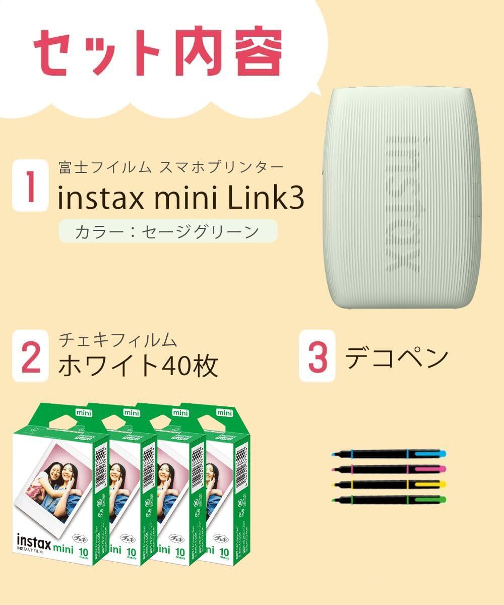 チェキ スマホプリンター instax mini Link3 セージグリーン&フィルム40枚&デコペン(6点セット)
