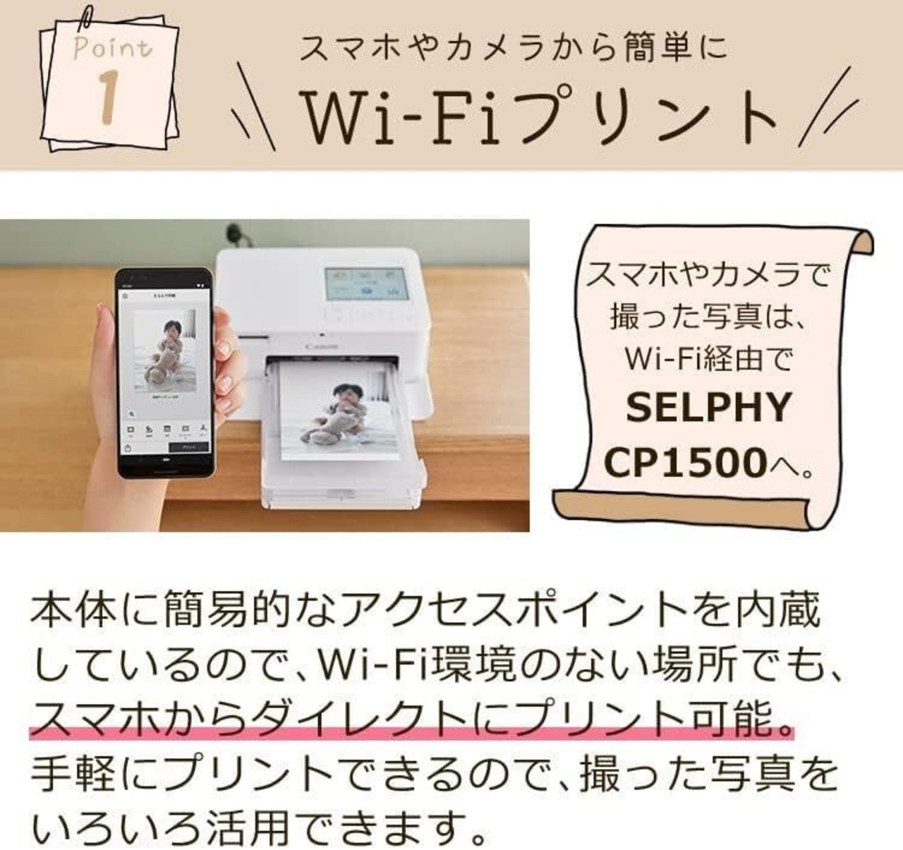 スマホやカメラで撮った写真は、Wi-Fi経由でSELPHY CP1500へ。