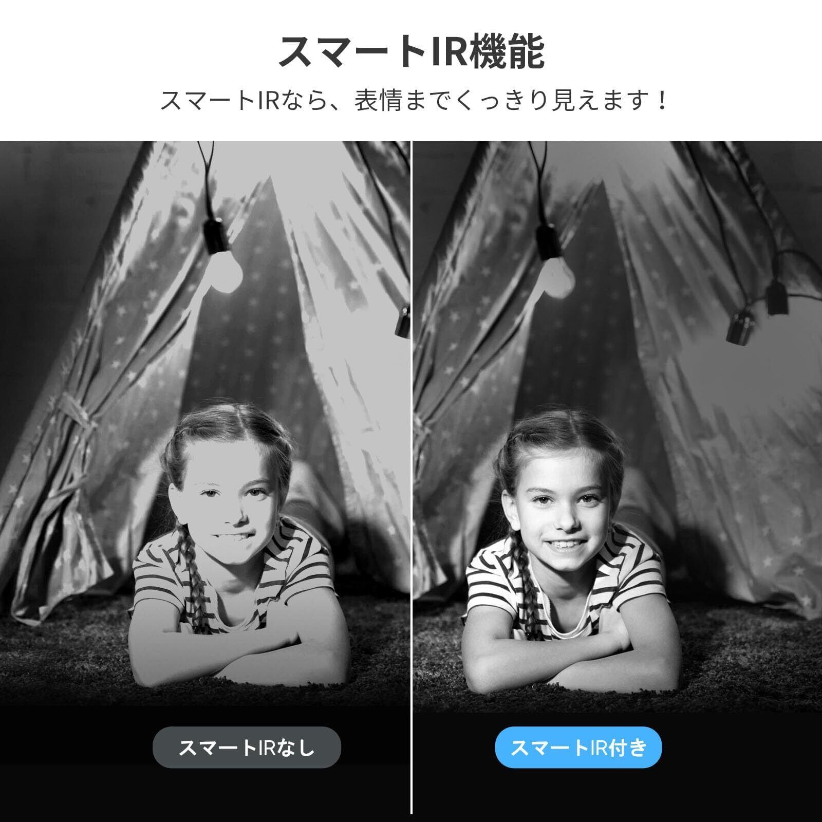 【夜は白飛びで見えにくい】Smart IRが赤外線の強さを自動調整し、ナイトビジョン約10mで暗所もクリア。就寝時のベビーモニターにも。