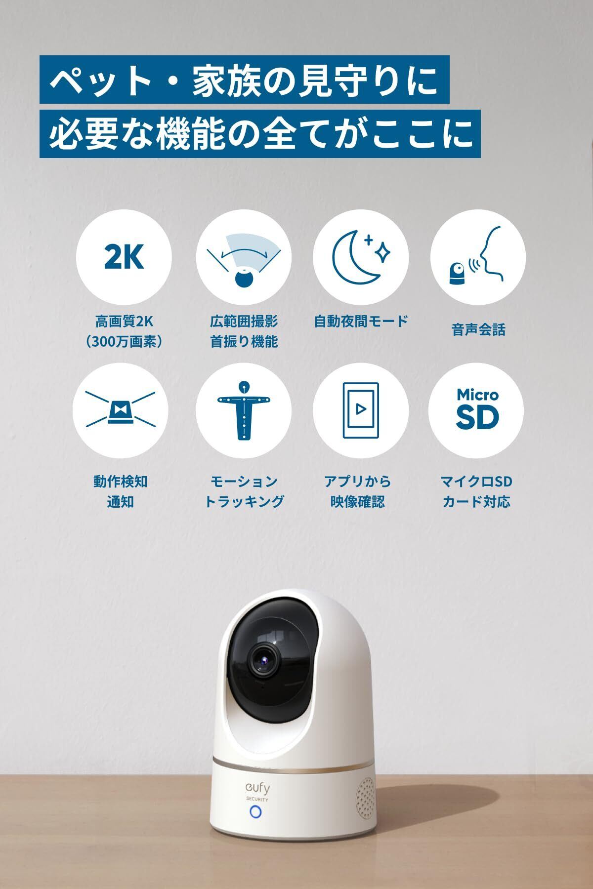 Anker Eufy IndoorCam 2K Pan & Tilt(見守りカメラ)【屋内カメラ/ネットワークカメラ/ベビーモニター/ペット見守り/音声アシスタント/ナイトビジョン/モーショントラッキング/全周囲監視】