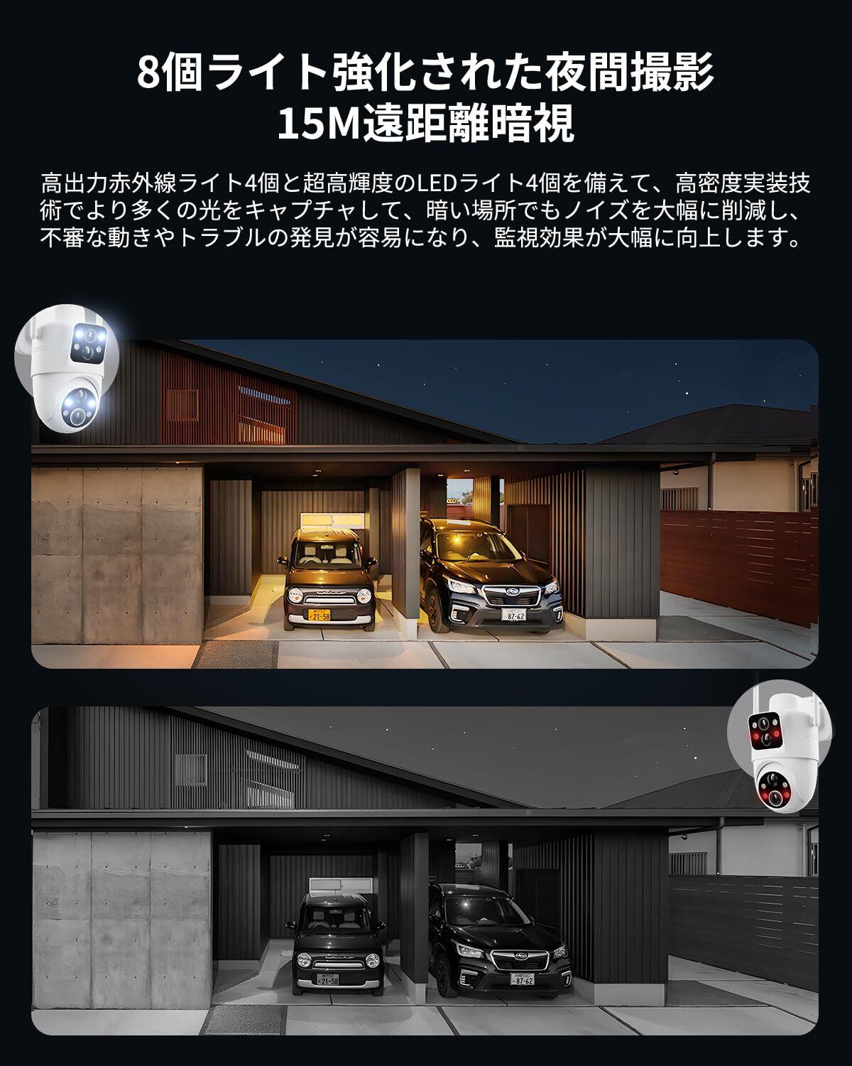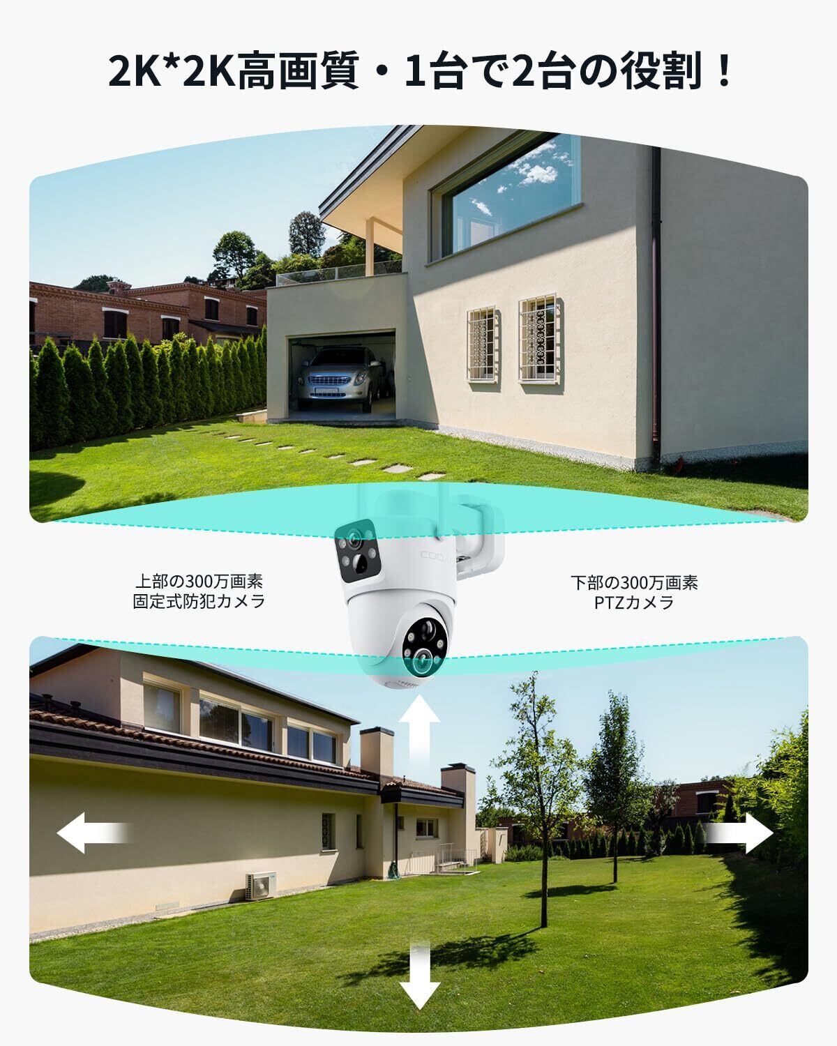 【外部5DBIアンテナ・2K*2K高画質・遠隔でも双方向会話】監視カメラは強力な5DBIアンテナを備え、高い電波貫通性能と耐干渉性能により長距離のデータ転送を実現します。玄関、一戸建て、ドアに設置、賃貸などルーターから離れた場所でもより安定したスムーズな映像を楽しむことができます。透明度の高い、大口径の3MPレンズを二つ搭載し、光の屈折を効果的に低減します。カメラが全方向からの情報を2Kの解像度で取り込み、保護エリアの全体像を細部まで見逃さずに確認することができます。カメラにスピーカーとマイクを搭載していて、カメラ越しにすぐに声をかけて、子供やペットのいたずら・敷地内に侵入者に警告、宅配便の再配達をお願いしたりできて便利です。