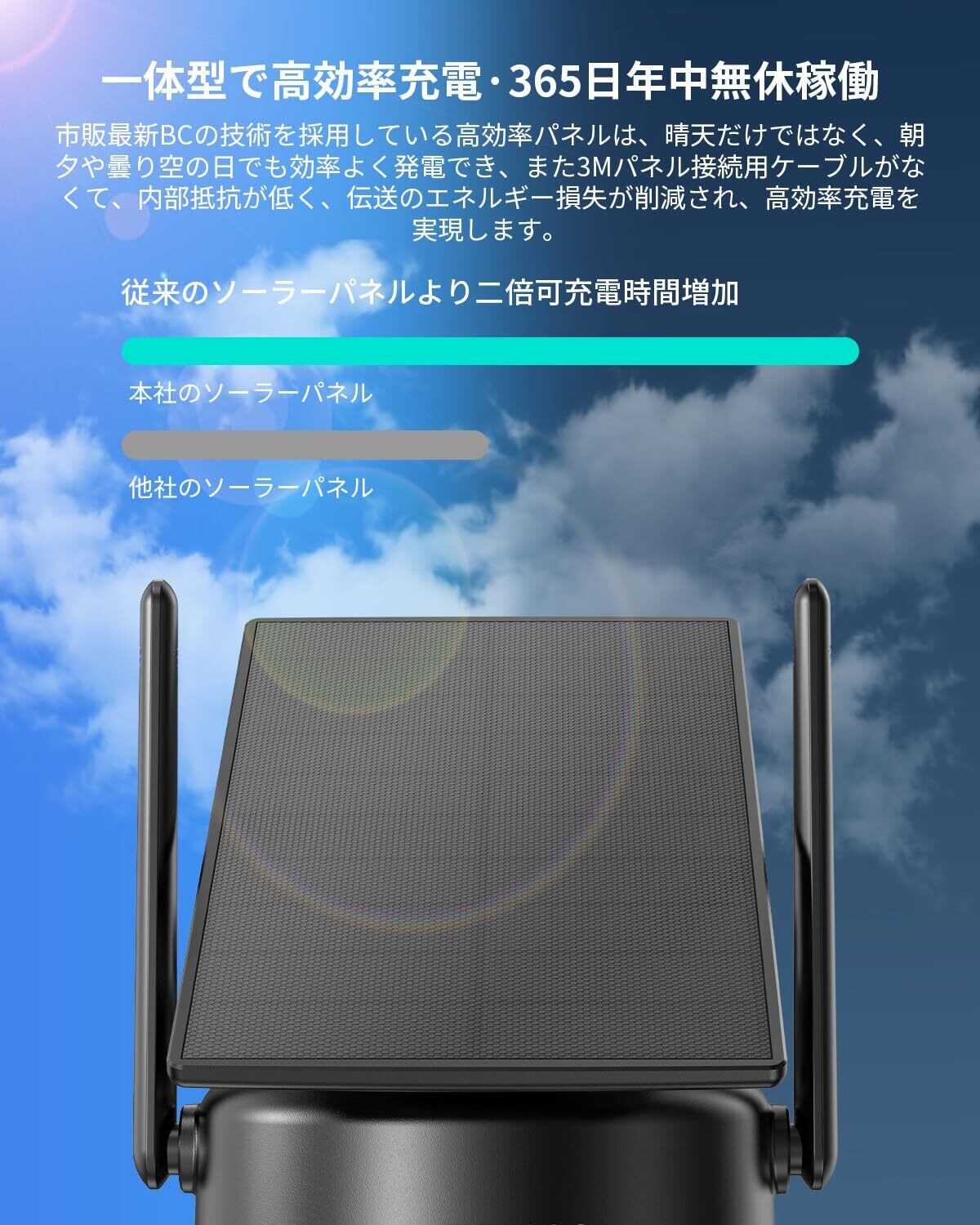 【新登場ソーラーパネル一体型モデルで完全無線●高効率充電40%向上●外部5DBIアンテナ】2025最新の完全無線一体型設計により、面倒な配線・設置が一切不要!太陽光で充電されるソーラーパネルがカメラ本体と一体になっているため、別途電源ケーブルとソーラーパネルの設置工事と時間を省略して、誰でも簡単に設置できます。最新のBC技術を採用しており、光を効率的に吸収できるよう設計されています。晴天だけではなく、曇りの日や朝夕時などでもしっかり発電でき、高効率充電を実現します。強力な5DBIアンテナを備え、高い電波貫通性能と耐干渉性能により長距離のデータ転送を実現します。玄関、カーポート、庭などルーターから離れた場所でもより安定したスムーズな映像を楽しむことができます。