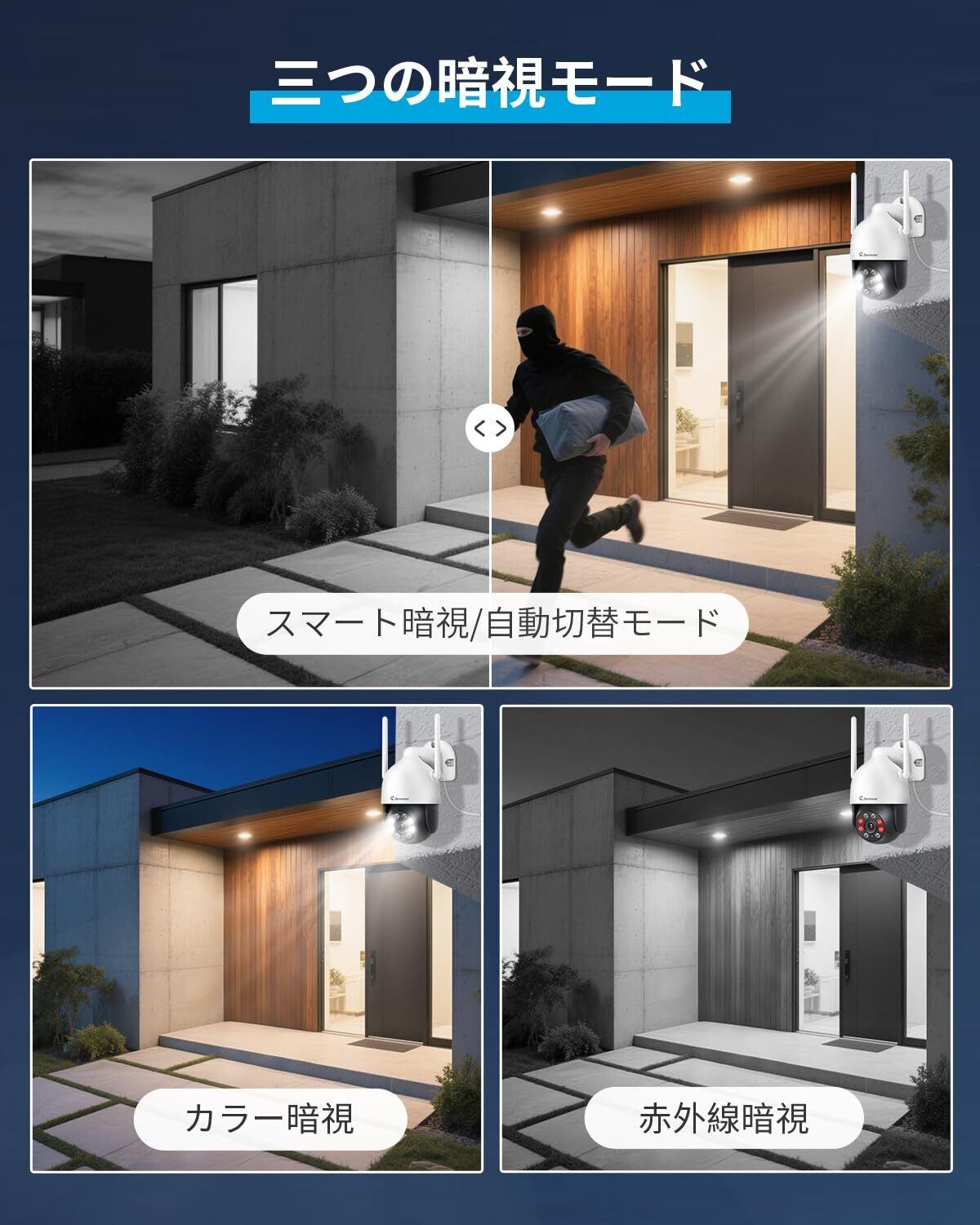 【スマート暗視撮影&自動追尾機能】赤外線ライトが4個搭載し、日中と夜間で撮影モードを自動で切り替えてくれるので便利です。夜間20mの可視距離を達成できます。また、白色LEDライト4個付き、怪しい人を検知すると、カメラのLEDライトが点灯して、不審者に威嚇効果があります。更に、パン/チルト機能が搭載し、水平に0~355 Degree、垂直に 0~90 Degree 範囲に角度調整可能です。自動追尾機能が付き、不審者が検出されると、カメラは自動的に追跡を開始し、アラームを実行します。広範囲の撮影が可能なため、店舗や車庫や事務所や牛舎や工場などの夜間監視に最適です。