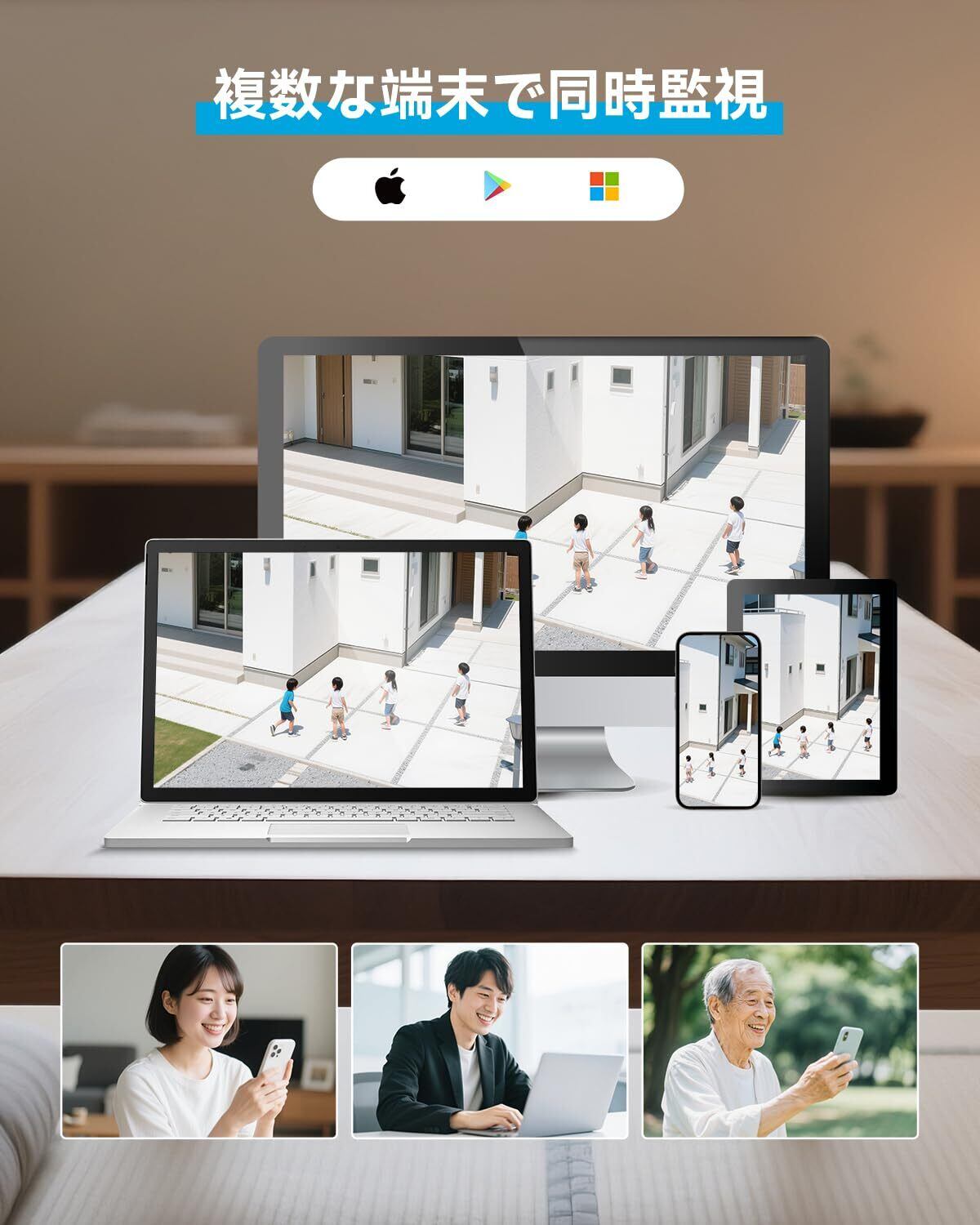 【複数端末対応&RTSP&Alexaに対応】スマホやパソコンやタブレットに対応可能屋外防犯カメラです。カメラを自宅のルーターに接続したら、外出先でも即時に家の状況を監視できます。また、パソコンやスマホでipカメラの動きを遠隔制御でき、画角が広めで死角はほとんどありません。カメラをご家族のスマートフォンに共有し、家族みんな同時に同じ画面を閲覧できます。一台カメラは4台のデバイスまで同時に接続できます。一台スマホで最大限64台カメラまで対応できます。また、オープンなRTSPプロトコルにより、監視カメラをBlue IrisやiSpyなどのサードパーティ製ソフトウェアに接続でき、監視可能です。(ご注意:パソコンソフトは監視用だけです。パソコンソフトでカメラの設定を操作できません。)