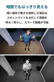 AIカメラ搭載:人の動きを検知し自動で録画を開始するAIカメラを搭載し、細かな動きも逃さずに撮影。夜間や暗い場所などで動きを検知した場合はスポットライトを点灯して、フルカラーで録画することが可能です。