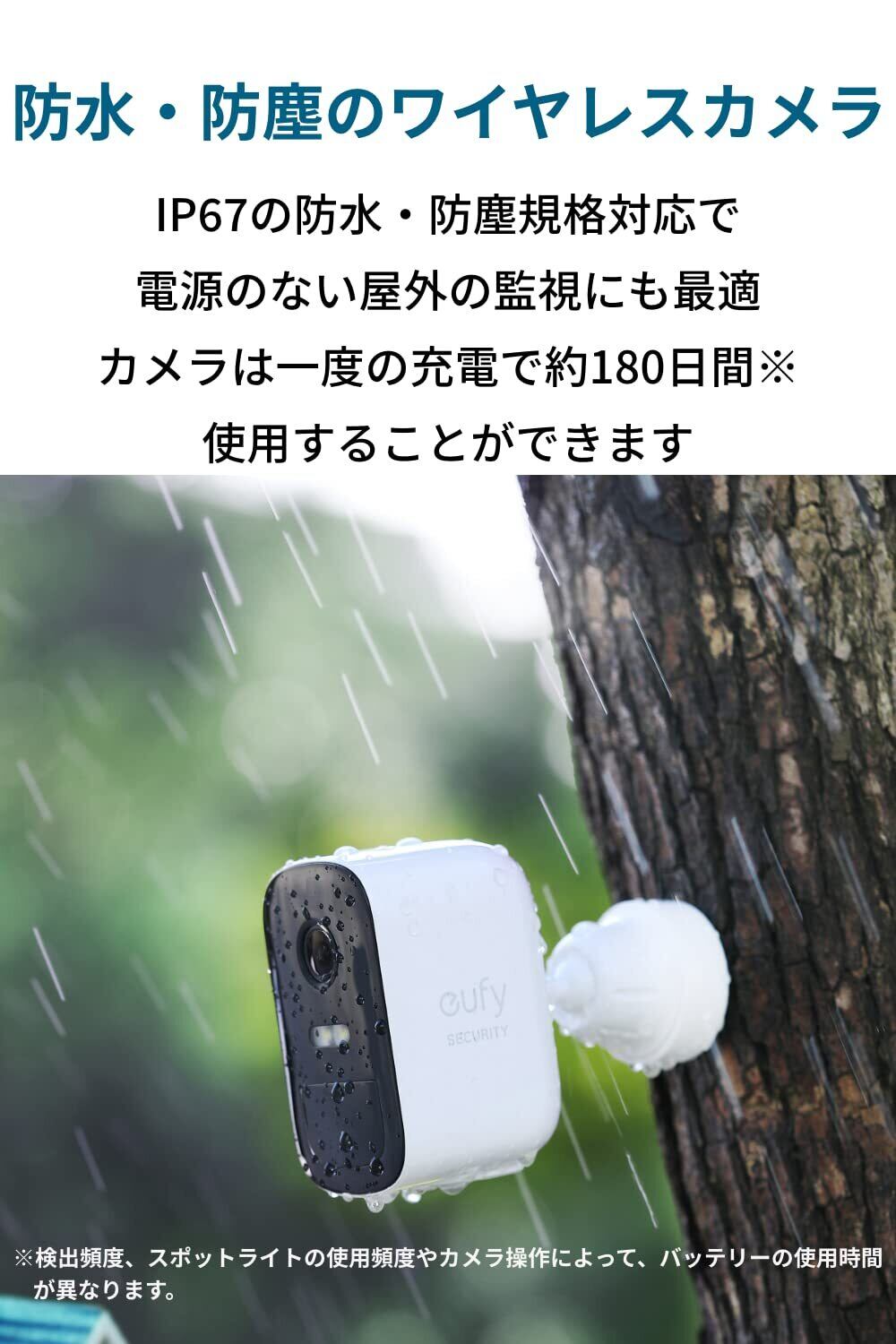 屋外監視に最適:eufyCam 2Cと撮影データを保管するHomeBase 2のセットで、ワイヤレス接続が可能。カメラは1回の満充電で約180日間使用可能。IP67防水防塵規格で屋外監視に最適です。