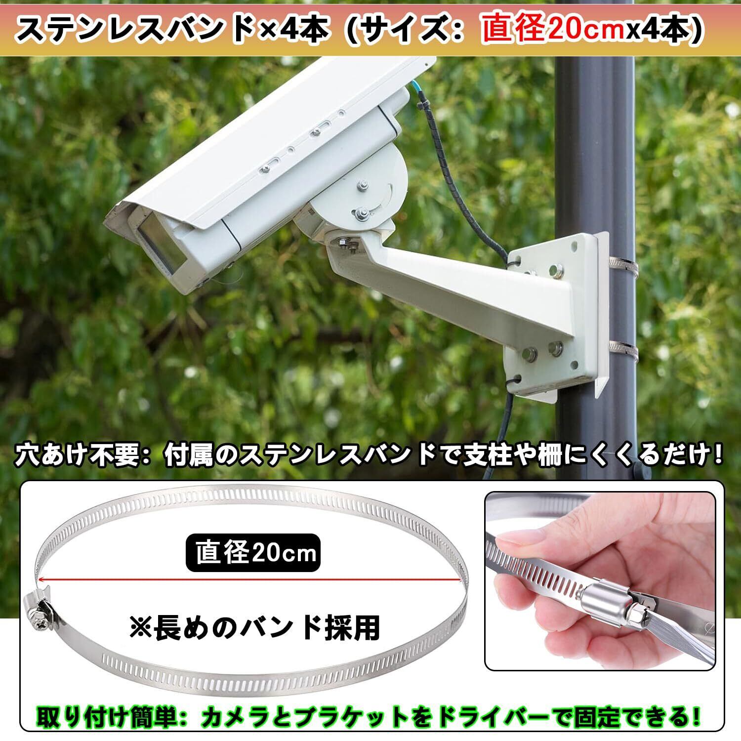 【必要なものフルセット装備】セット内容:防犯カメラ 取付金具x2、ステンレスバンドx4本(サイズ直径:200mm、長さは63cm)、M4x18mmステンレスネジセットx8セット)。防犯カメラを設置したい場合に活用できる防犯カメラ取り付け用のブラケットセット。取り付ける環境:室内/室外。※家と家族と財産を守る安全安心グッズです!購入前にサイズを確定してください。