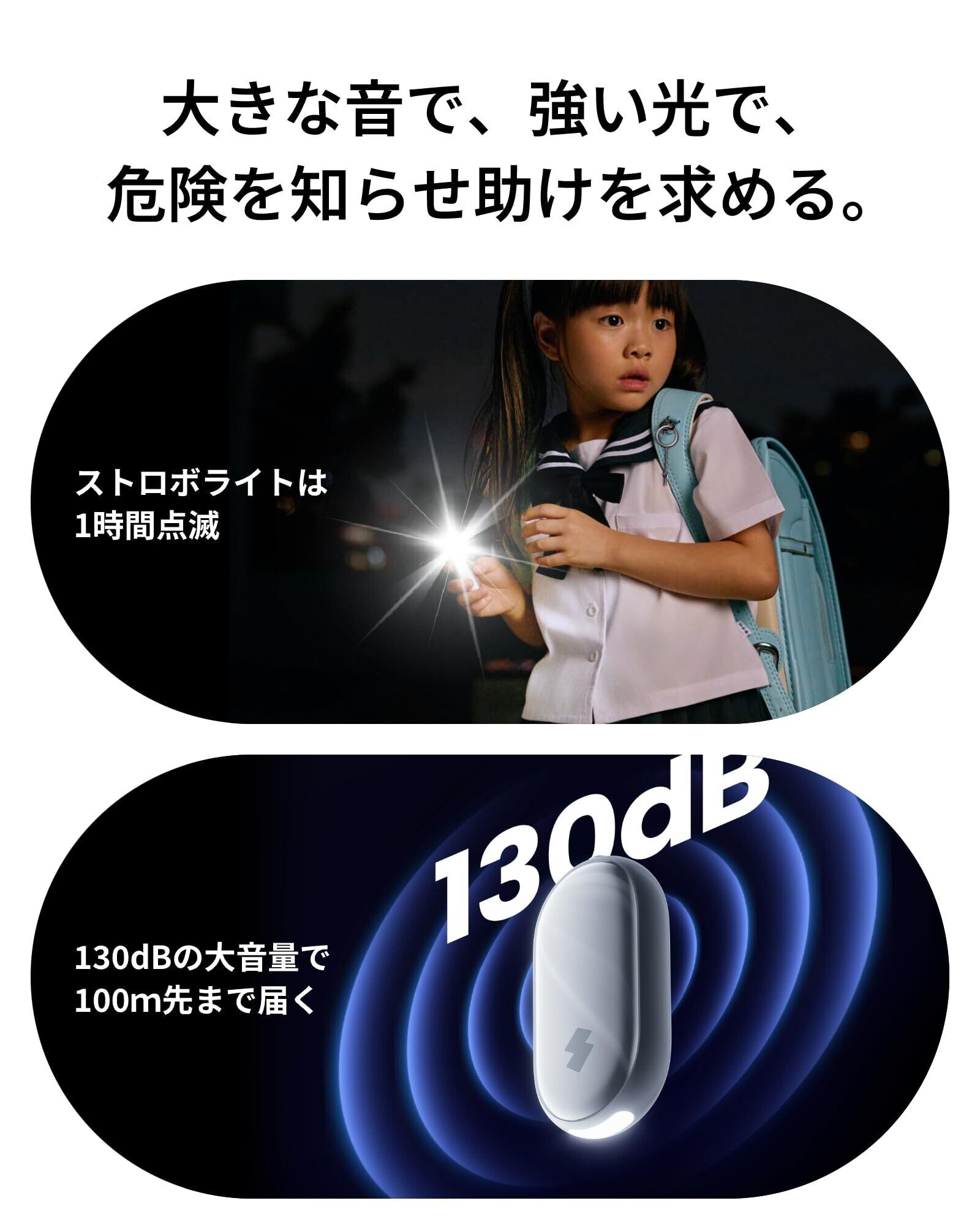 【大音量防犯ベル×「探す」アプリで子どもの安全を守る】 いざという時は、「探す」アプリから、子どもの「今どこ?」「危ない!」がすぐ分かります。不審者に遭遇したら、迷わずピンを抜きましょう。130dB(100m先まで聞こえるレベル)の大音量でブザーが鳴り、警報ライトが高速で点滅します。周りの大人に危険を知らせて、犯人を撃退しましょう。また、Appleの「探す」から、日本全国どこでも、お子さまの携帯品の位置をいつでも確認することができます。