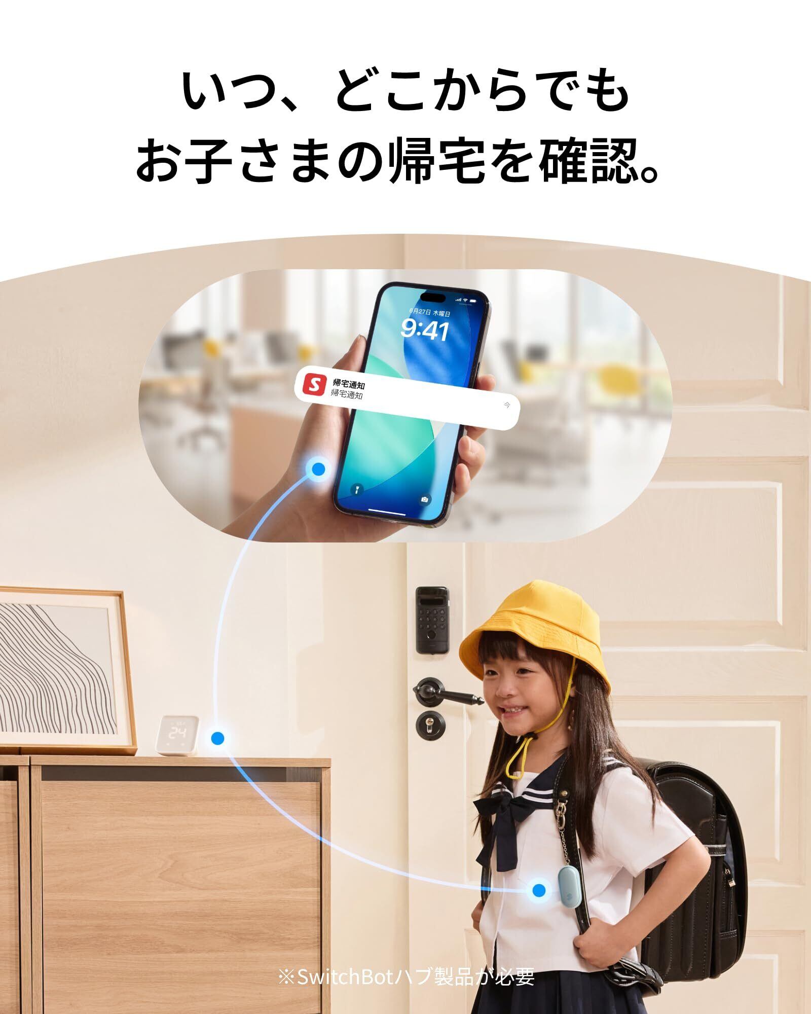 【お子さまの帰宅をアプリで自動通知】 SwitchBot防犯ブザーをランドセルに付けた状態で、ハブのBluetooth圏内に入ると、「帰宅」通知がアプリに届きます。これにより、仕事中や家事中でもリアルタイムでお子さまの帰宅を確認できます。