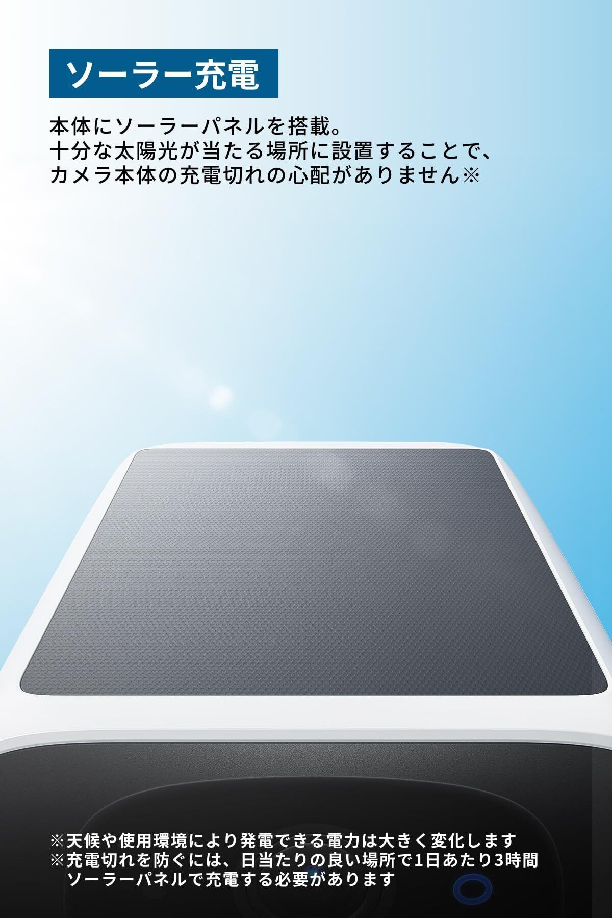 ソーラー充電:本体にソーラーパネルを搭載。十分な太陽光が当たる場所に設置することで、カメラ本体の充電切れの心配がありません。 ※天候や使用環境により発電できる電力は大きく変化します ※充電切れを防ぐには、日当たりの良い場所で1日あたり3時間ソーラーパネルで充電する必要があります