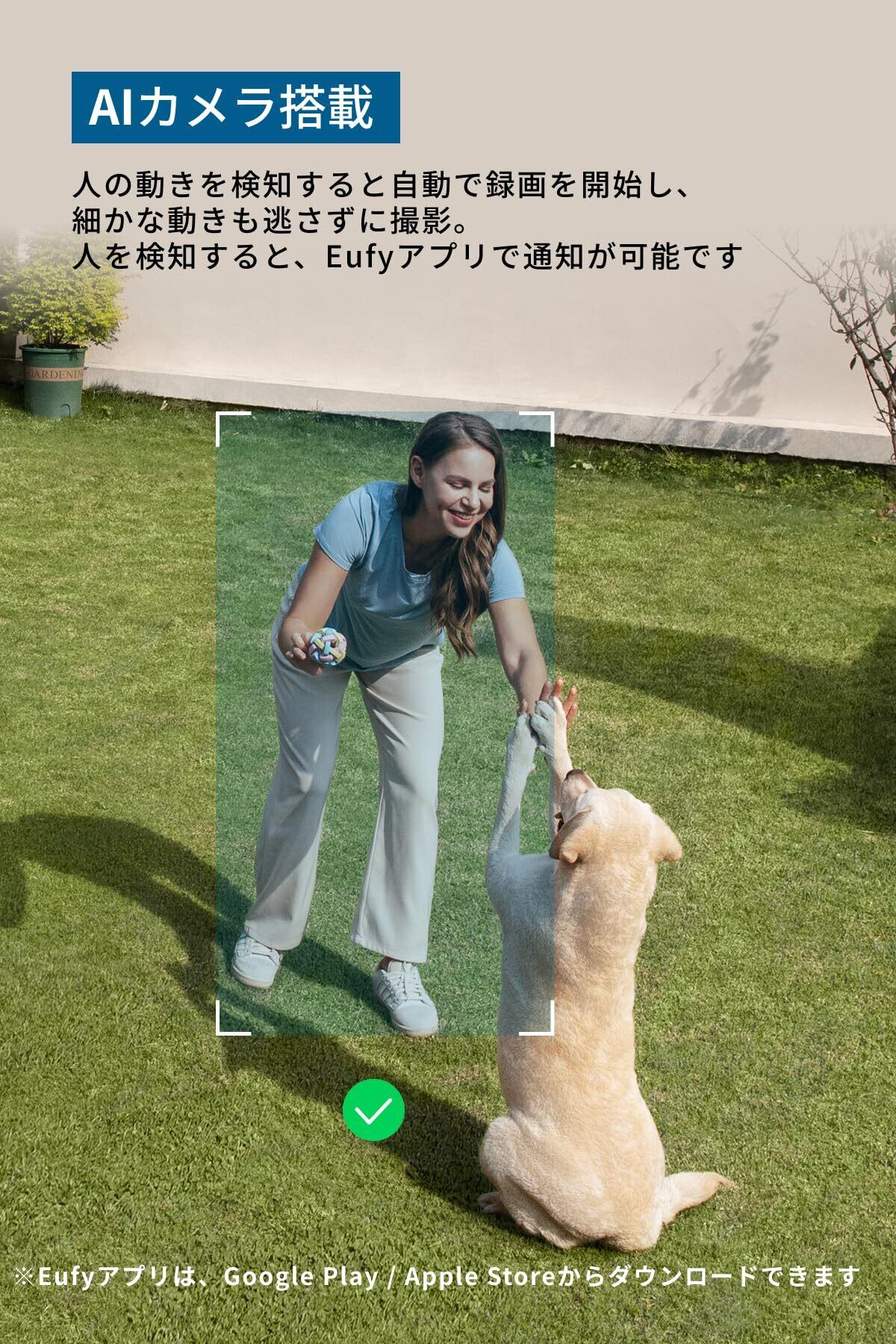 AIカメラ搭載:人の動きを検知すると自動で録画を開始し、細かな動きも逃さずに撮影。人を検知すると、Eufyアプリで通知が可能です ※Eufyアプリは、Google Play / Apple Storeからダウンロードできます。