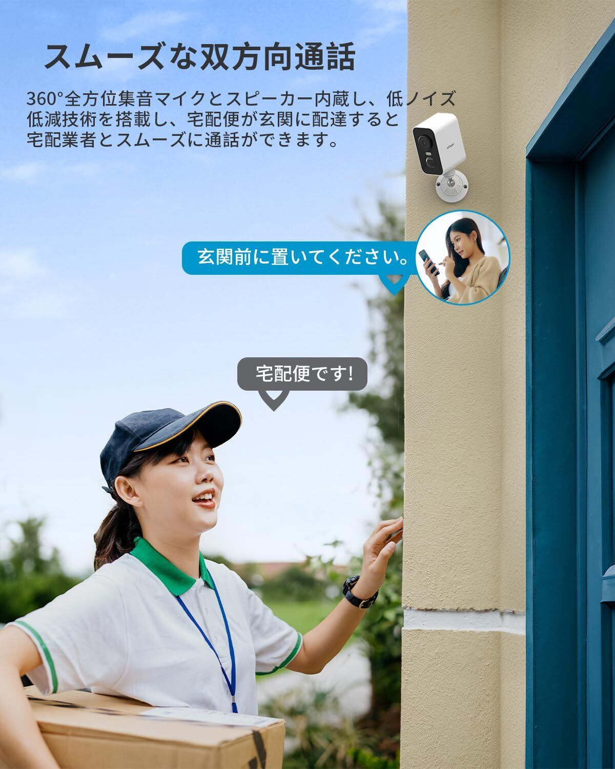 ■【双方向音声で安心コミュニケーション!】内蔵のスピーカーとマイクにより、カメラからの音声で話しかけることができます。また、訪問者とのリアルタイムコミュニケーションも可能で、留守中でも安心して対話できる環境を提供します。