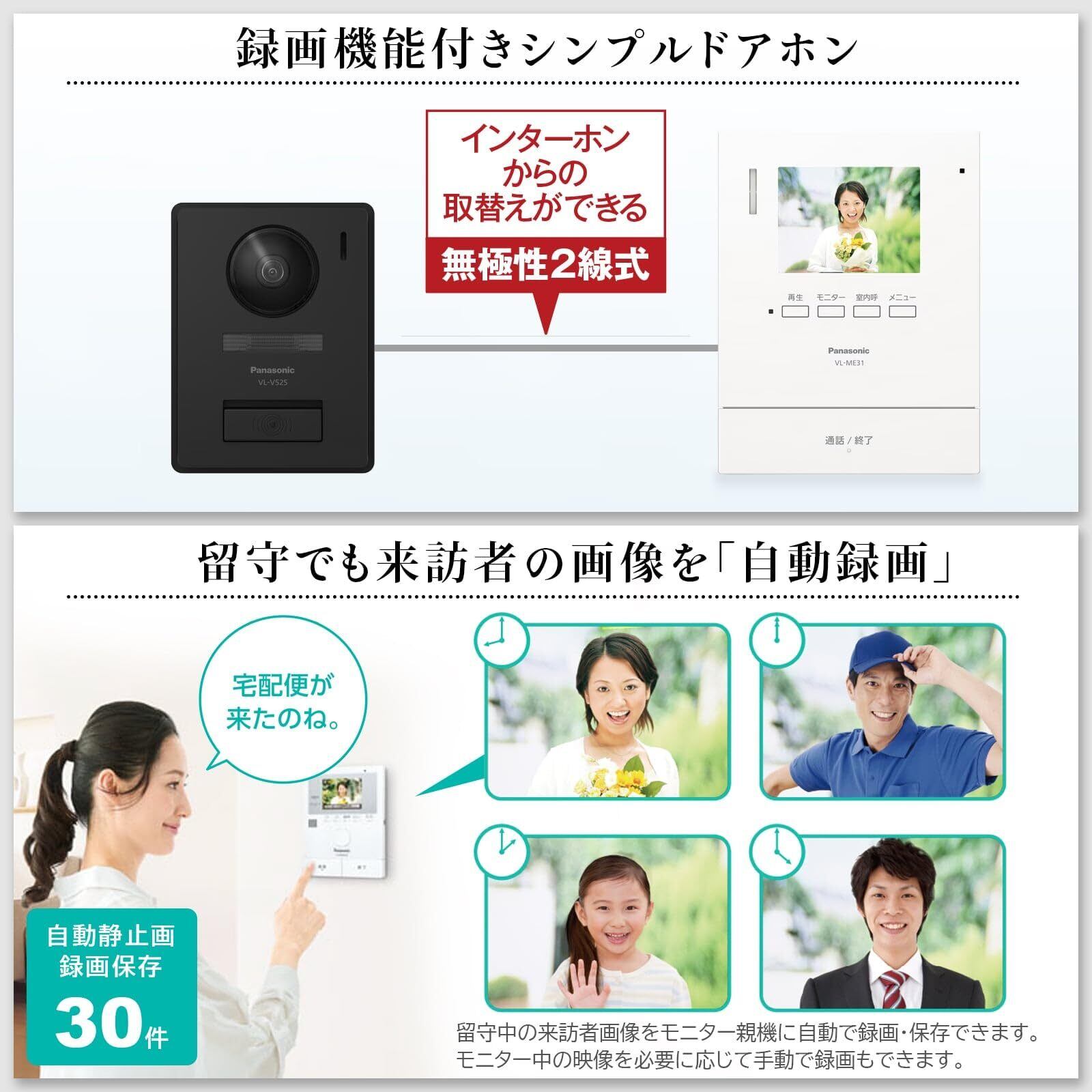 [パナソニック] テレビドアホン 電源直結式 代理応答機能 外にも火災警報 自動録画機能付 手動録画 増設モニター 室内通話 モニター3.5型TFTカラー液晶 玄関子機 露出型 LEDライト VL-SE31XL