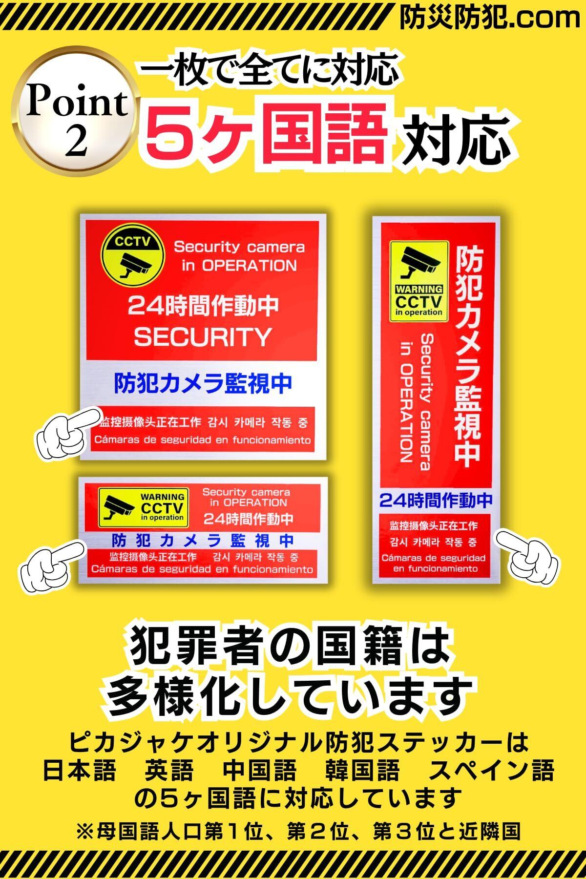 ■【多言語対応で安心感を広げる!】この防犯ステッカーは、日本語、英語、中国語、韓国語、スペイン語の5か国語に対応しており、国籍を問わずさまざまな人々にメッセージを伝えられます。これにより、外国人の訪問者にも安心感を提供し、防犯意識を高める効果が期待できます。