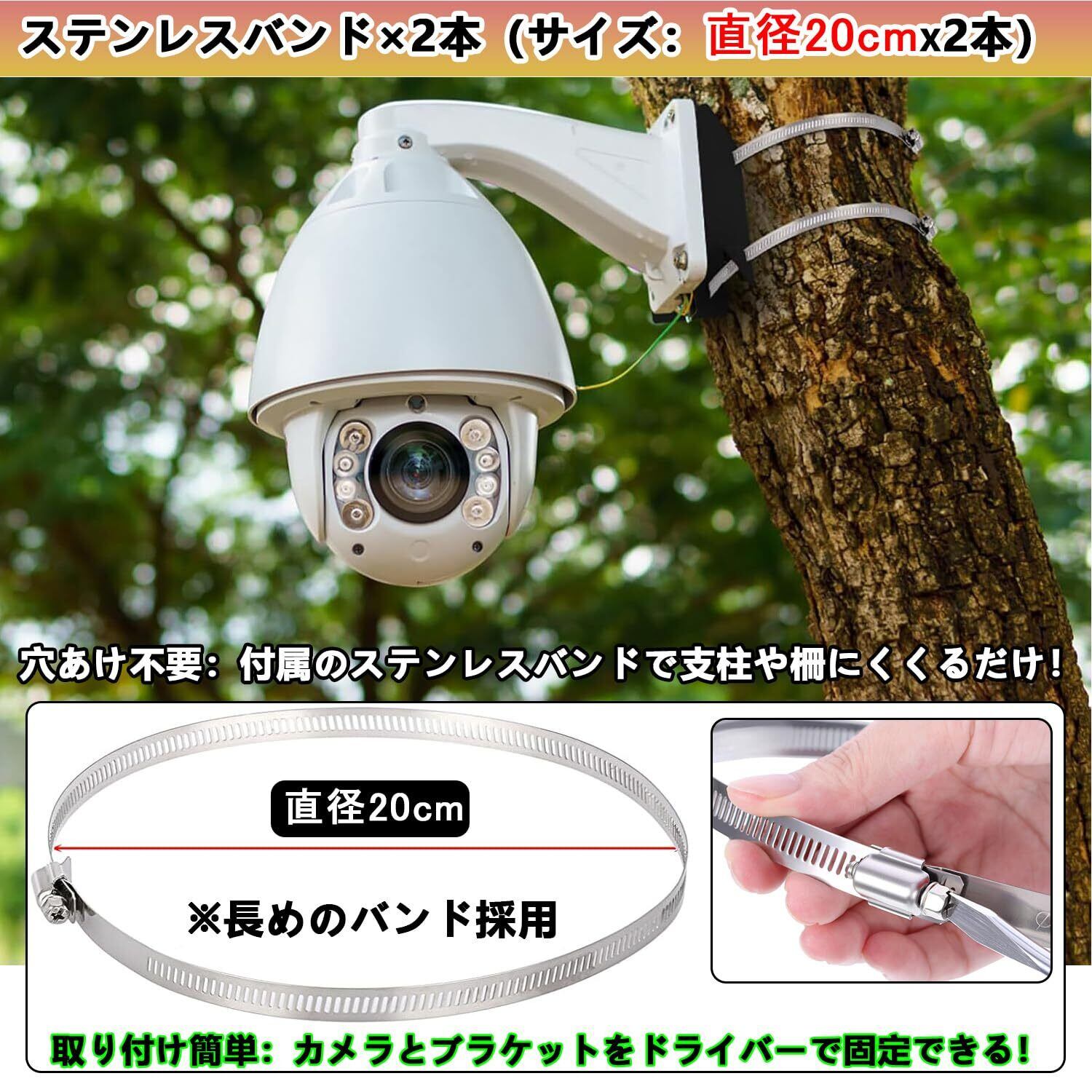【必要なものフルセット装備】セット内容:防犯カメラ 取付金具x1、ステンレスバンドx2本(サイズ直径:200mm、長さは63cm)、M4x18mmステンレスネジセットx4セット)。防犯カメラを設置したい場合に活用できる防犯カメラ取り付け用のブラケットセット。取り付ける環境:室内/室外。※家と家族と財産を守る安全安心グッズです!購入前にサイズを確定してください。