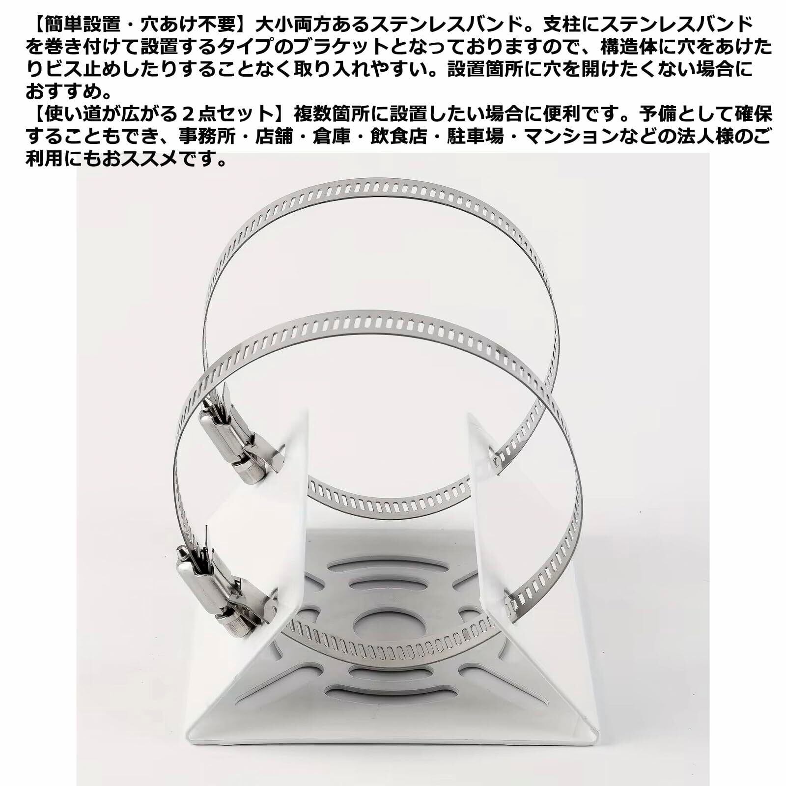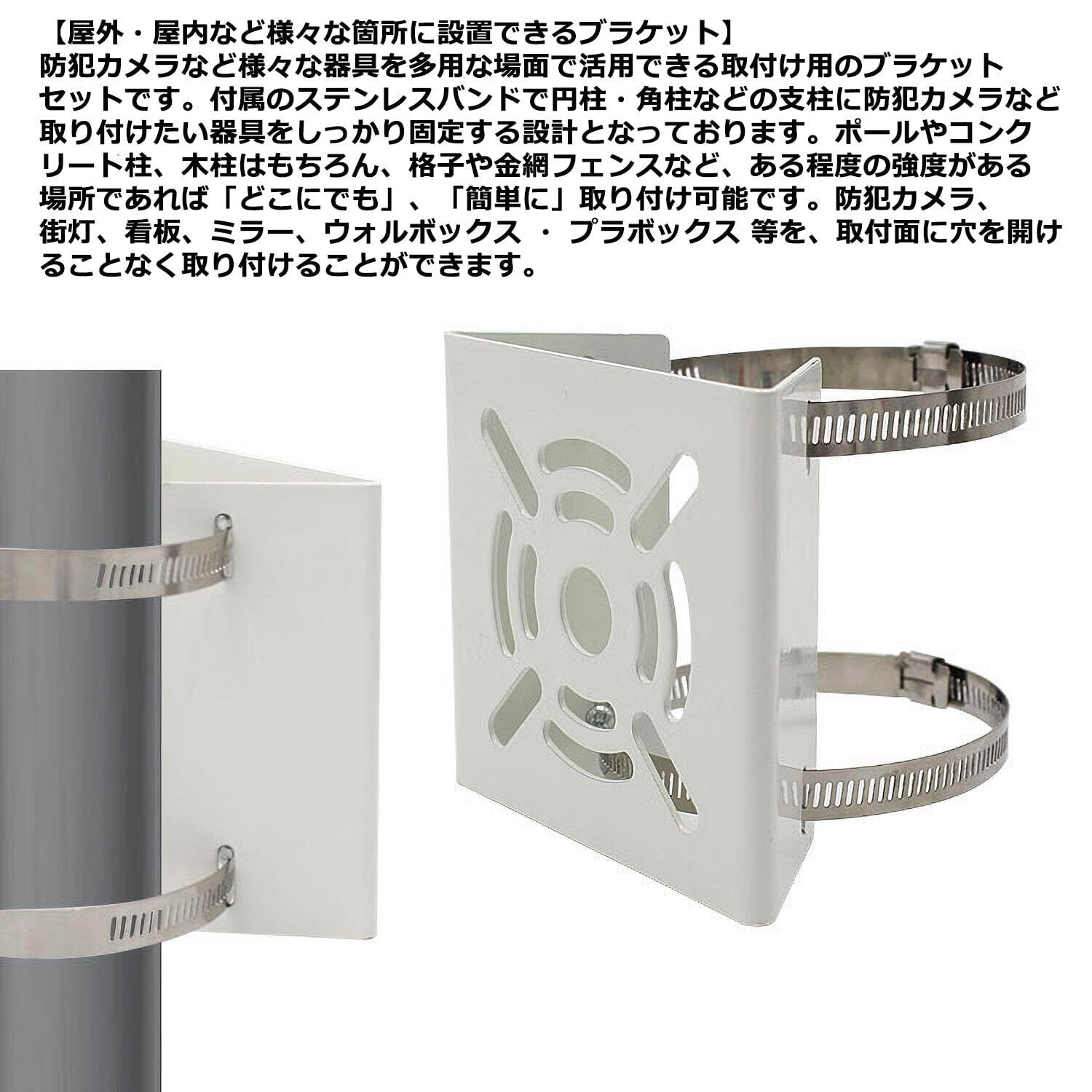 【屋外・屋内など様々な箇所に設置できるブラケット】防犯カメラなど様々な器具を多用な場面で活用できる取付け用のブラケットセットです。付属のステンレスバンドで円柱・角柱などの支柱に防犯カメラなど取り付けたい器具をしっかり固定する設計となっております。ポールやコンクリート柱、木柱はもちろん、格子や金網フェンスなど、ある程度の強度がある場所であれば「どこにでも」、「簡単に」取り付け可能です。防犯カメラ、街灯、看板、ミラー、ウォルボックス ・ プラボックス 等を、取付面に穴を開けることなく取り付けることができます。