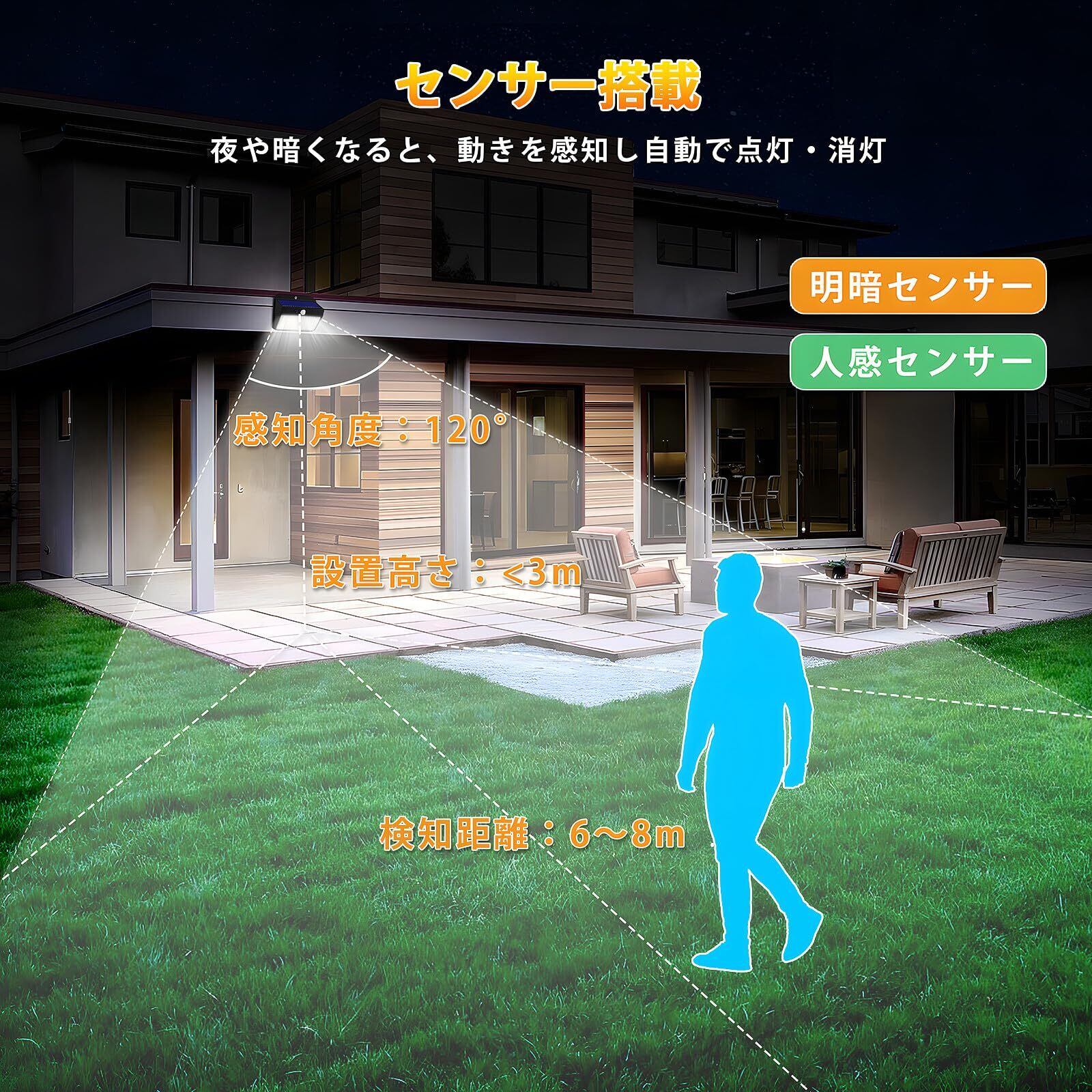 【センサー搭載&自動点灯・消灯】 本製品は人や動物の動きを感知して点灯・消灯を行う人感センサーと明るさに反応して点灯・消灯する照度センサーを搭載しております。人感センサーの検知距離は最大8m、検知角度は120度で、広範囲にわたって人を検知することができます。周囲の明るさや動きに反応して自動で点灯・消灯できるため、電源オン・オフの操作手間がかかりません。