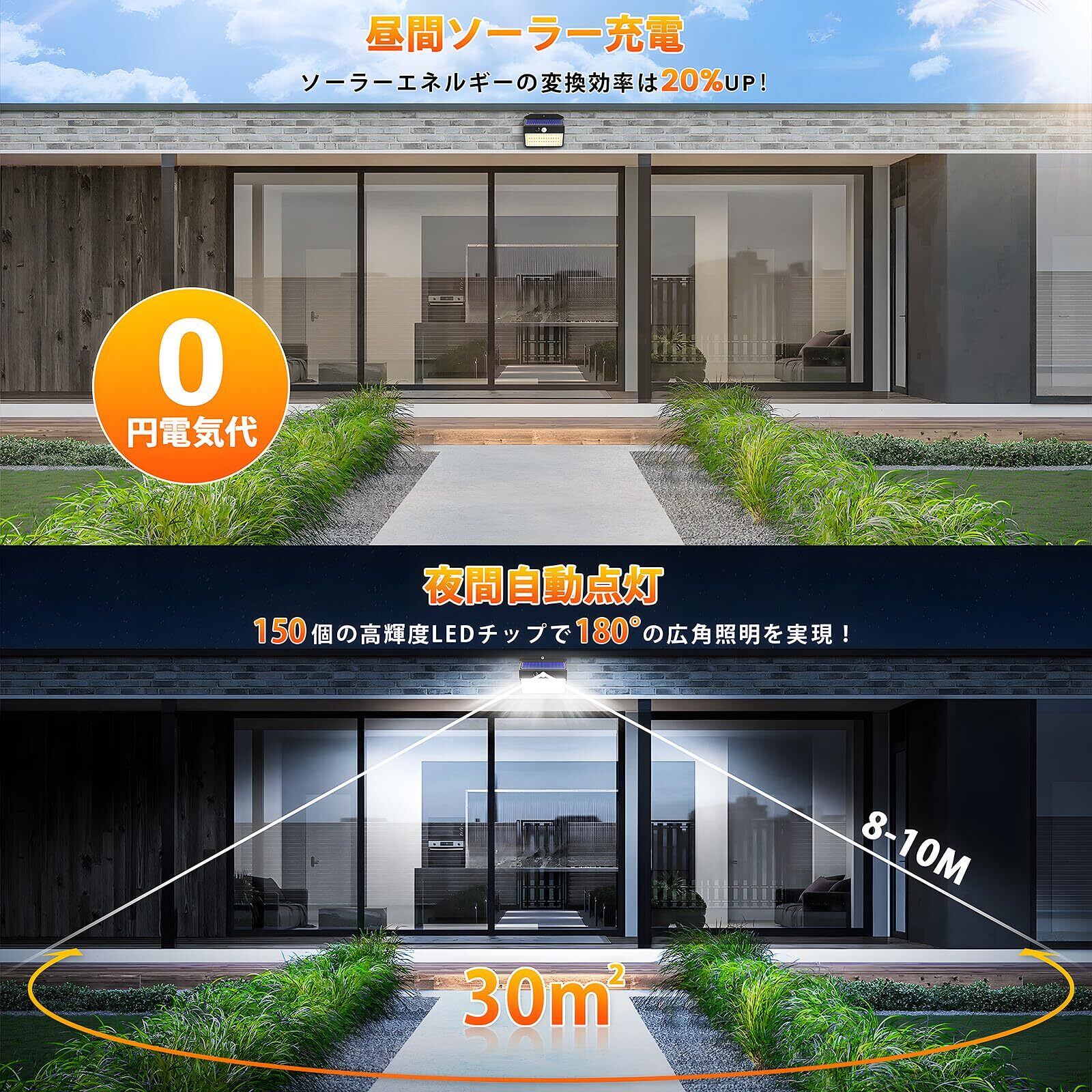 【150LED&高輝度センサーライト】 1個のセンサーライトには150個のLEDチップを搭載しており、180度の照明角度で幅広く照らすことができます。 1個の照明範囲:約30㎡、2個の照明範囲:約70㎡、4個の照明範囲:約150㎡。センサー付きで、暗い足元や玄関を照らす以外に、空き巣や泥棒対策の防犯ライトとしても有効な屋外用センサーライトです。壁掛け式で、玄関・カーポート・庭・バルコニー・駐車場など様々な場所に取りつけられます。