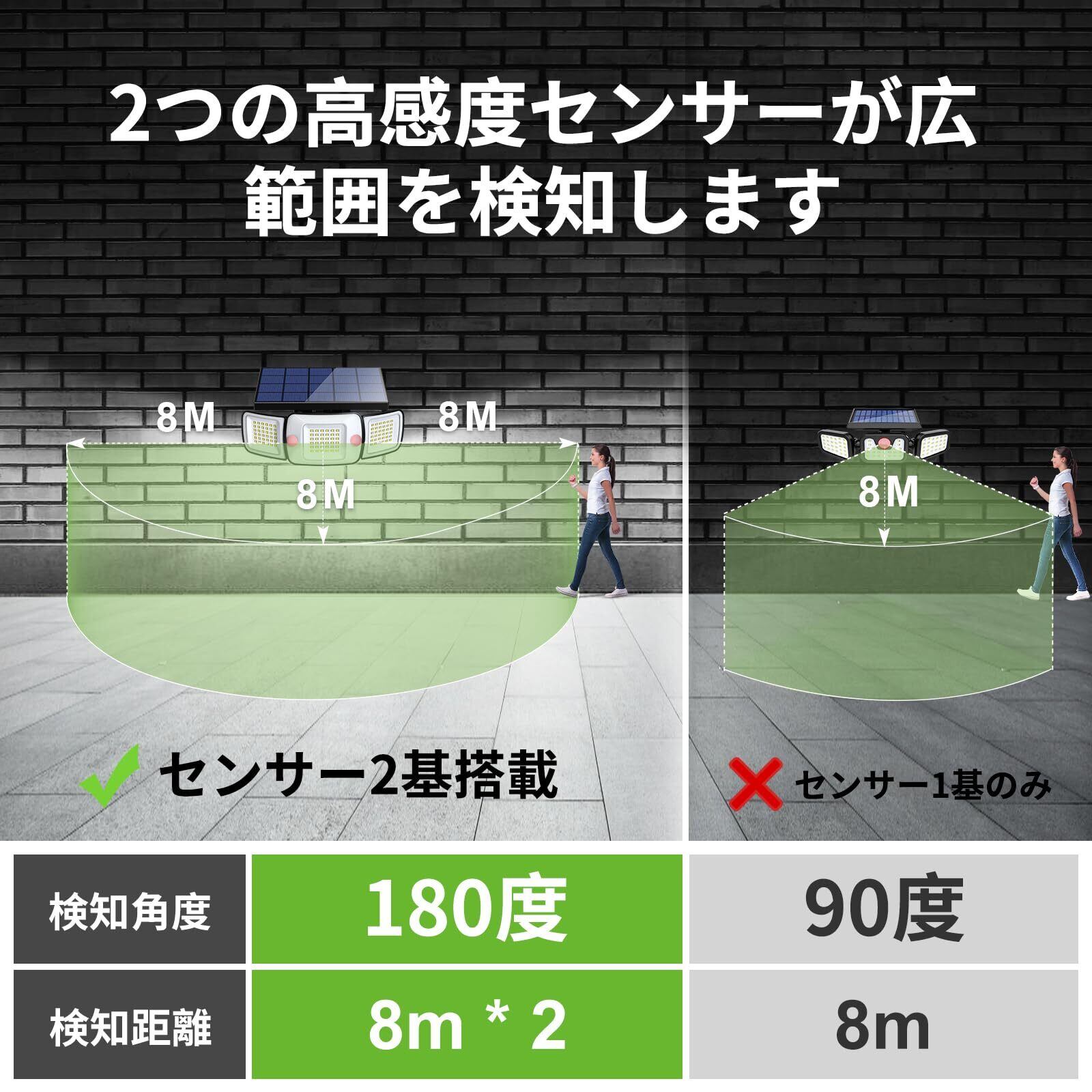 【独自のデュアルセンサー設計】 革新的な2つのセンサーで、従来のシングルセンサー(90度)よりも広い180度の範囲をしっかり検知。死角を減らし、夜間の防犯対策をより強化します。