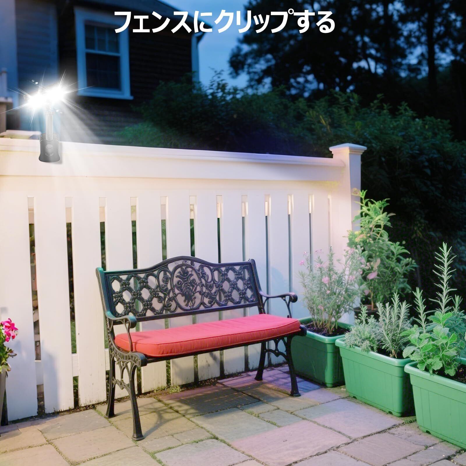 多機能クリップで簡単設置:フェンスやデッキに水平/垂直にクリップ可能。置き台やキャンプテーブルにも設置でき、柔軟なヘッド角度調節で照射方向を自由に調整!