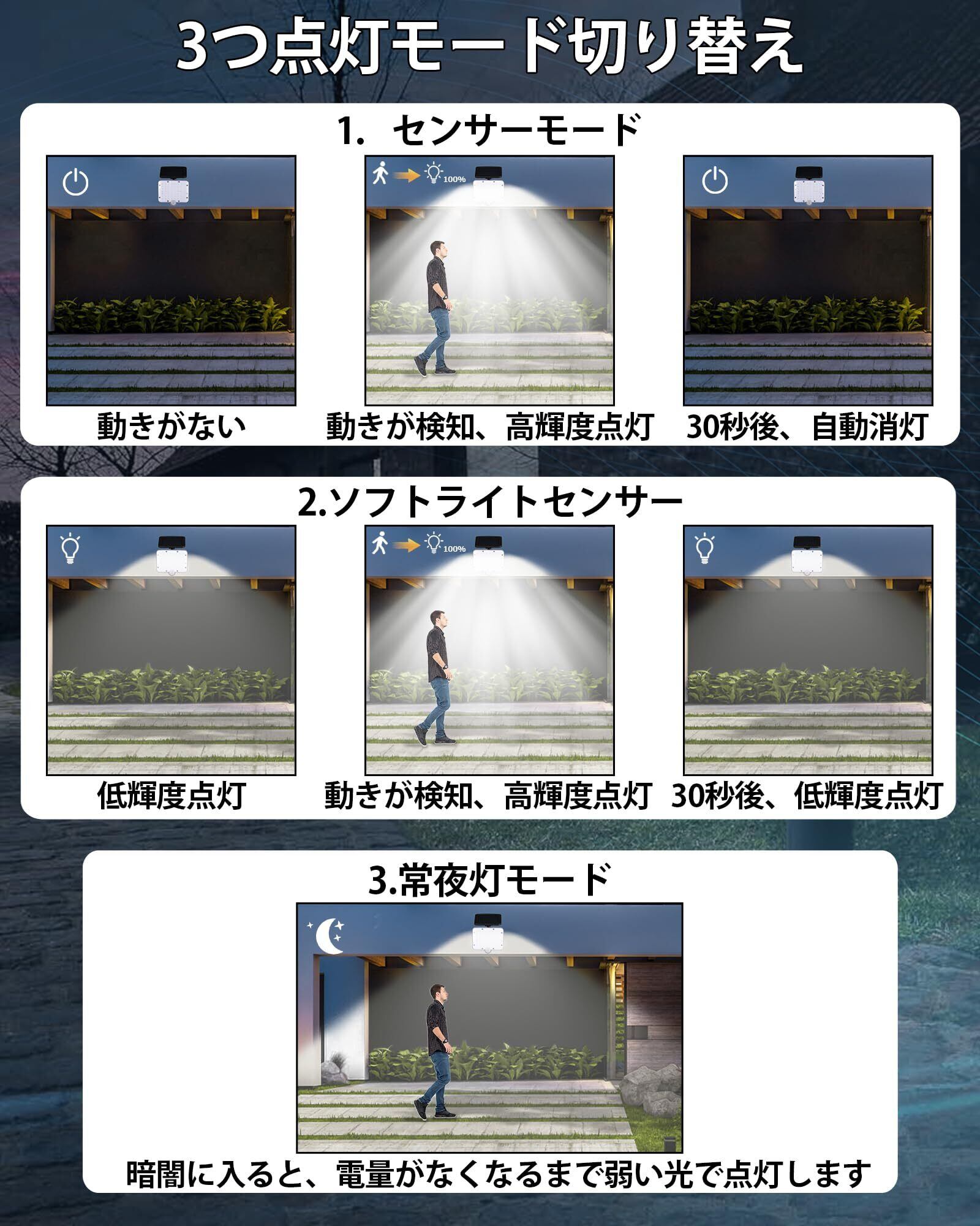 ■【高輝度LEDと最新のセンサー技術で明るい空間を演出!】本商品は、優れた人感センサーを搭載したソーラーライトです。最大の明るさを発揮し、夜間の駐車場や庭先、玄関をしっかりと照らします!高輝度のLEDがあなたの屋外を明るく照らし、安全を確保します。