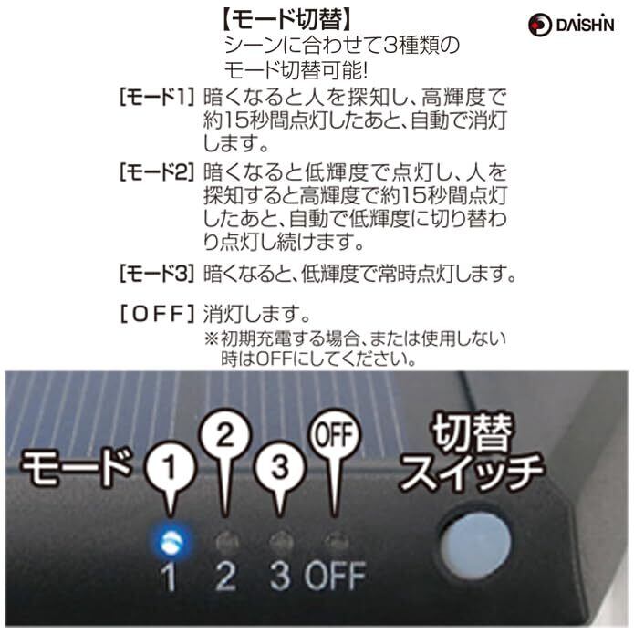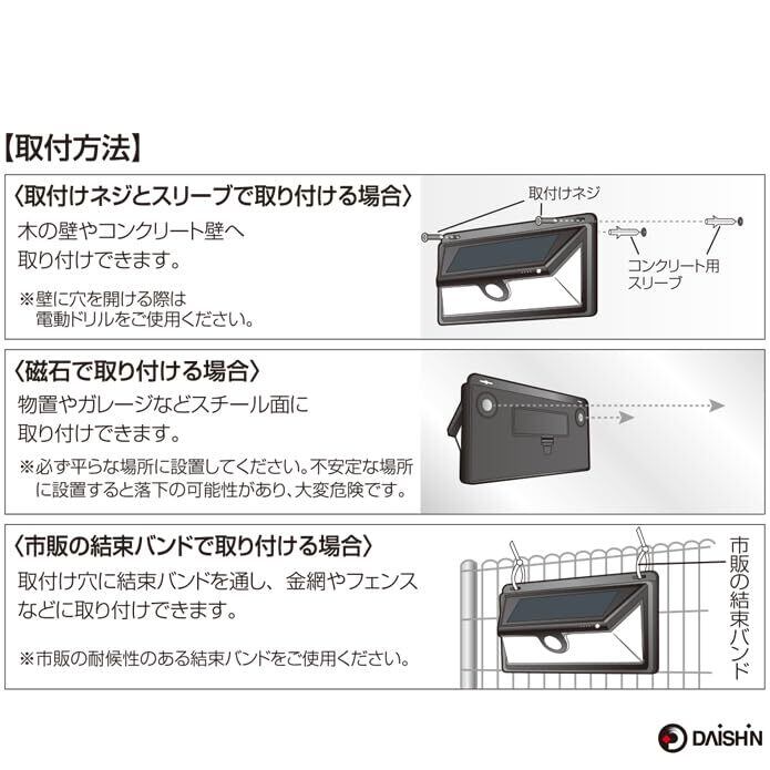 DAISHIN ソーラーライト DLS-WL005 センサーライト 屋外 ソーラー 人感 led 防雨 マグネット led 人感センサー ライト ルーメン 外 防犯ライト ソーラーライト ガレージ 庭 玄関 灯 広範囲 防犯ライト 駐車場 明るい 防水企画 防雨型