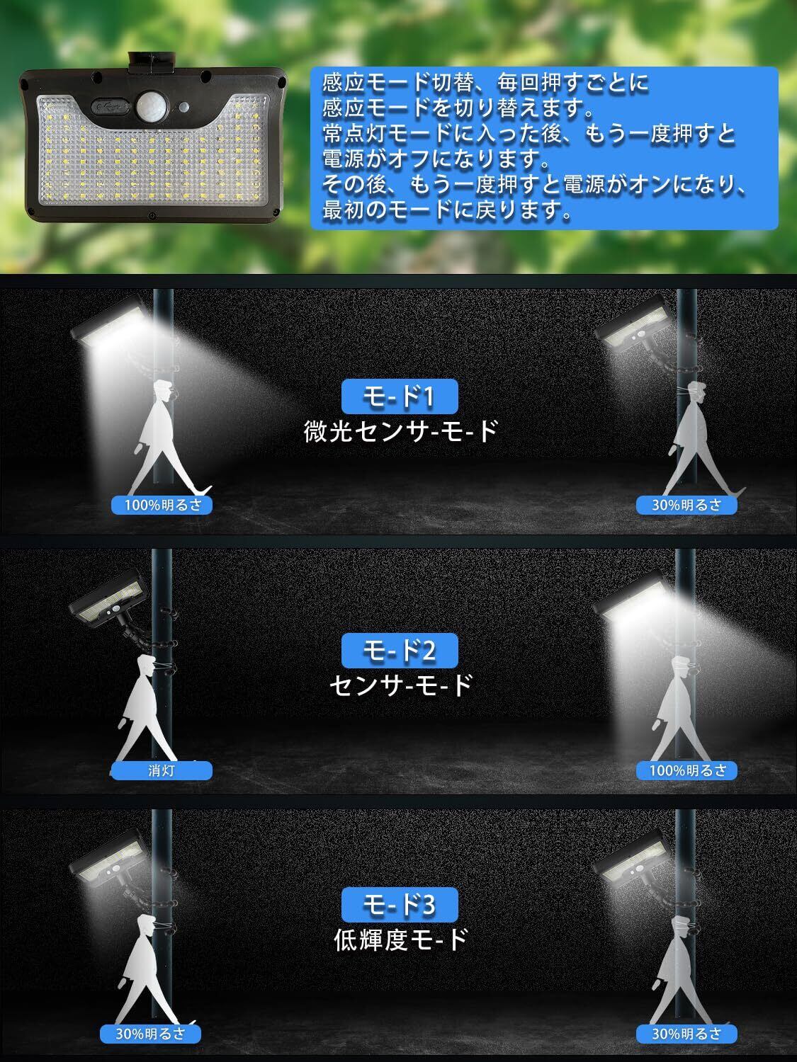 【3つの点灯モード・リモコン操作】のソーラーライトは光センサーと人感センサーが搭載されています。ボタンを押すだけで、3つのモードを設定できます。①DIMモード: 闇に入ると弱い光(長持ちする光)で点灯します。動きを感じされると強い光になり、15秒後、弱い光に戻ります。②センサーモード:闇になっても点灯なし。動きを感じされると強い光(フルパワー)になり、15秒後、消灯状態になります。③常時点灯モード: 暗闇に入ると、電量がなくなるまで点灯(30%)します。